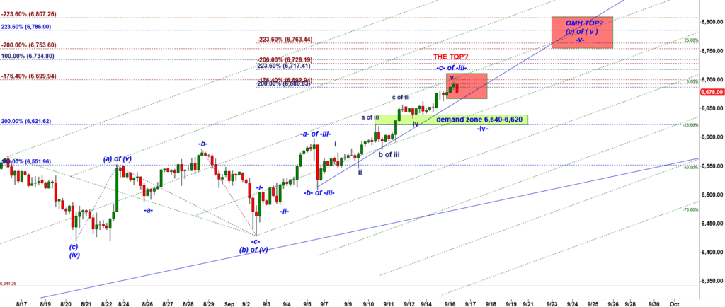 It is possible to count ES mini as having topped. However, At this point bulls have a setup to extend the rally to a higher Red Box if they manage to stop the next micro pullback at the green demand zone 6,640 – 6,620.