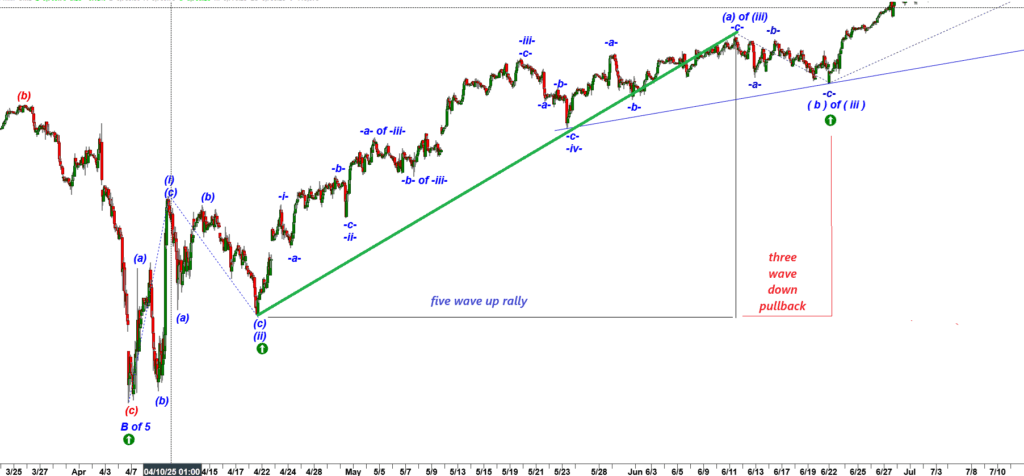 Upon completion of a five wave up rally we always expect a corrective three wave down move making a higher low. We can see that -a- down, -b- up, -c- down pullback that bottomed on June 22nd, 2025. I labelled it as a subwave (b) down of wave ( iii ) up.