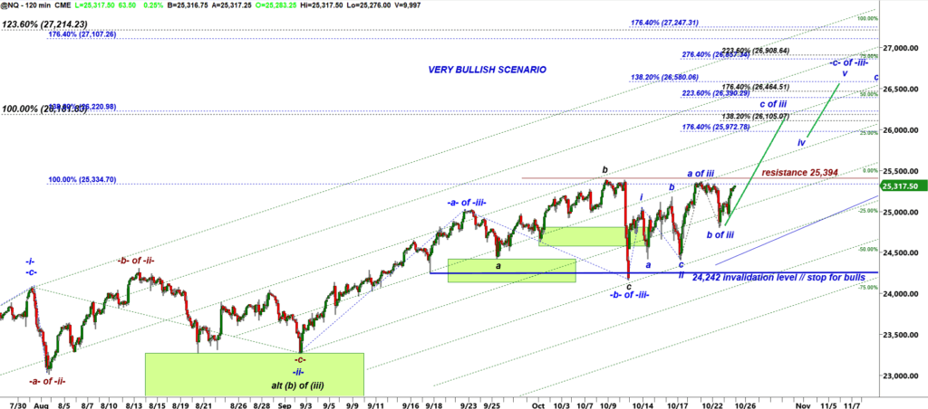 The move down we got this week can be labelled as a subwave b down of wave iii up. That means this push up can be counted as a starting accelerated rally in a subwave c of wave iii up. Bulls need to push NQ over the key resistance 25,394 to confirm that Very Bullish scenario.