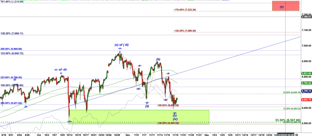 Here ES-mini might be working on a multi week trough comparable to the April 2025 low. This is why we can not exclude possibility for another push to a slightly lower low deeper into the green band. It should be noted that quite often a wave (iv) down re-tests / undershoots the low made b the previous pullback in a corrective wave -iv- down ( a pullback of one degree lower). That low was made at 6,540