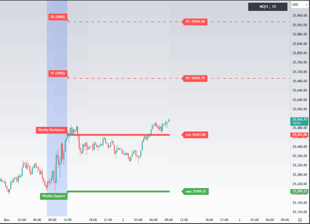 That breakout opens the door for extension of the rally up to the weekly R1 level = 25,692.