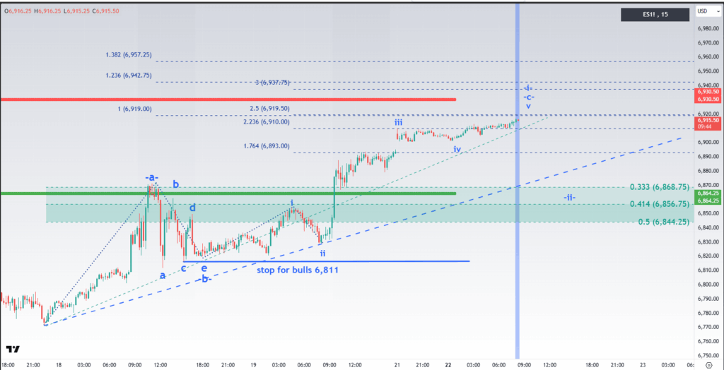 Note the red line on the 15 min chart. It is drawn at 6,930.50. That is the ideal target/resistance for this rally. That level was the weekly resistance for the last week. We will get new weekly resistance and weekly support this afternoon.
