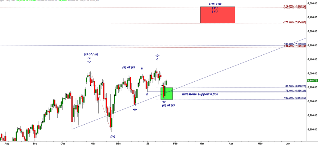 From the bullish perspective, the pullback we saw this week is viewed as the -c- subwave of a completed corrective structure: -a- down, -b- up, -c- down. Importantly, this correction produced a higher low relative to the low of wave (iv) from November 2025. That completed -a-b-c- decline provides a solid base for bulls to initiate another leg higher, with price now targeting the Red Target Box.
