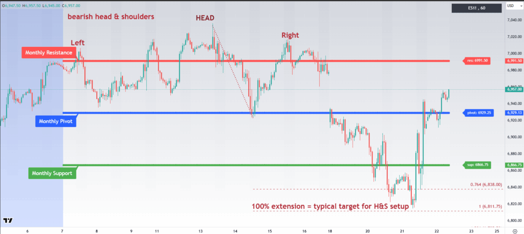 Earlier this week the bearish head and shoulders produced a nice impulsive looking drop that undershot the green monthly support 6,856: