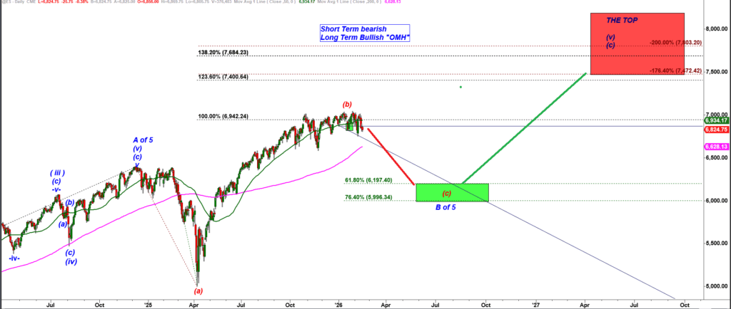 If this interpretation is correct, ES could experience a sharp pullback toward the upper boundary of the green box around 6,200 before resuming higher.