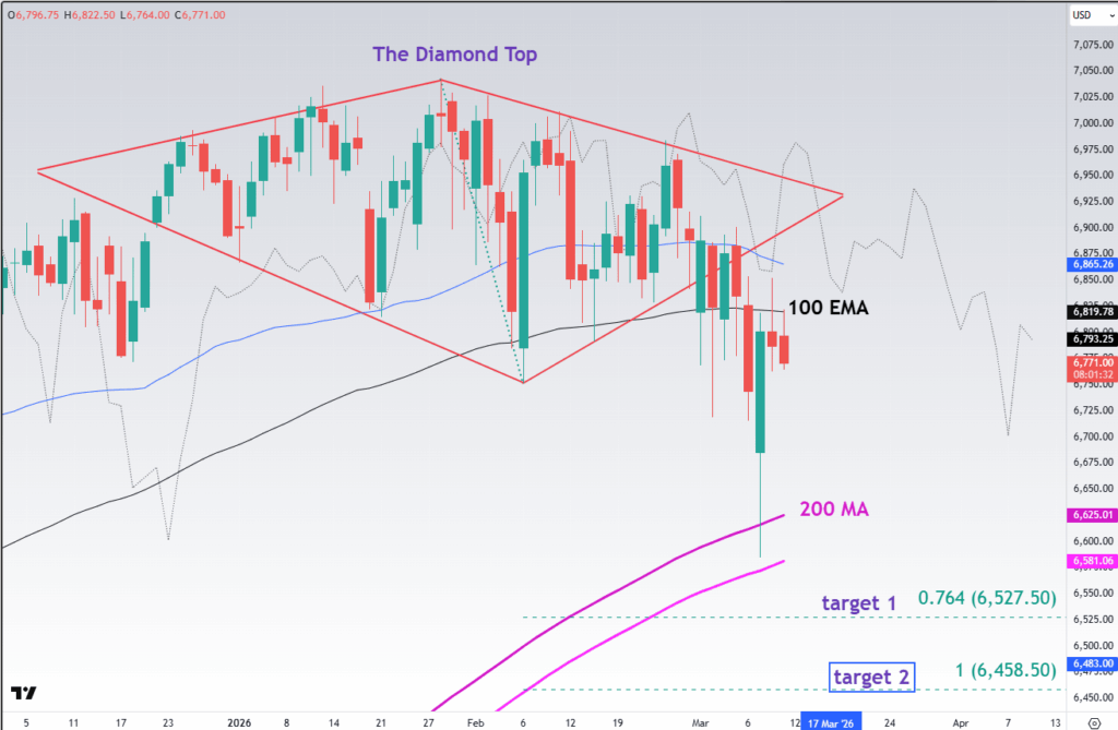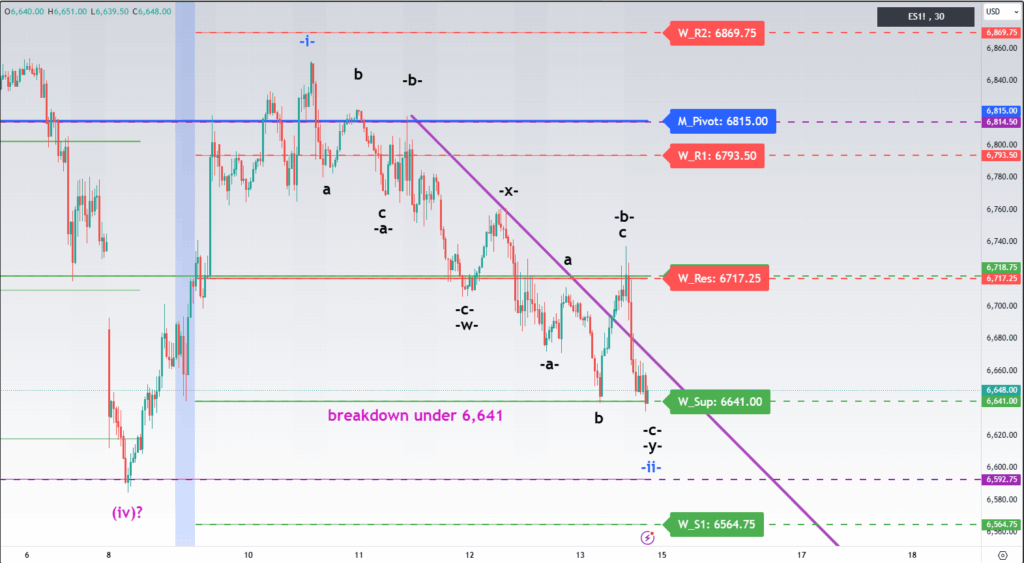 Bulls need to start a rally because a drop under 6,590 would invalidate the bullish -i- up, -ii- down setup and trigger a panic selling to our target 6,527