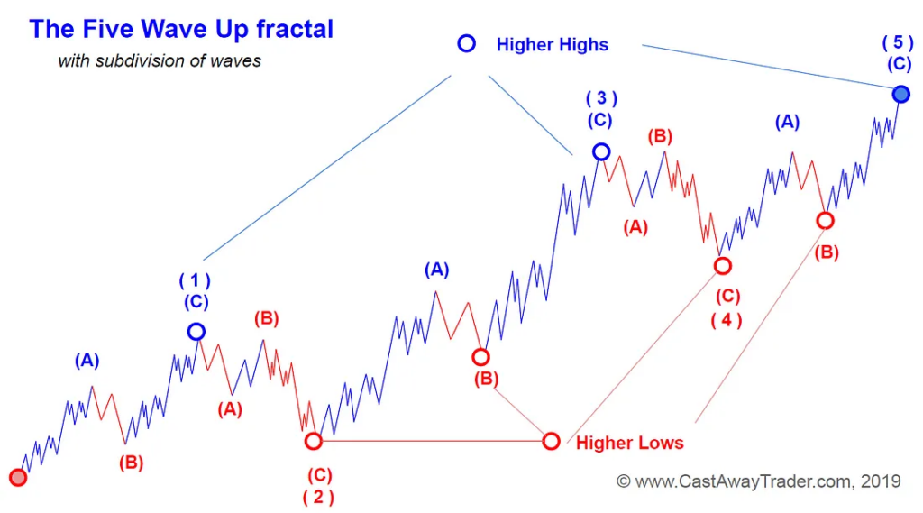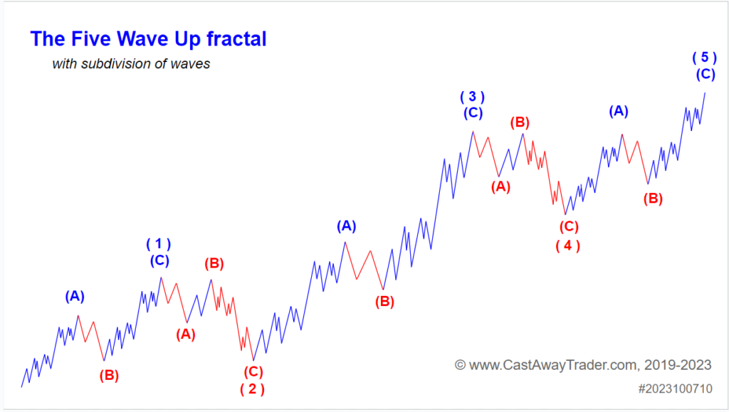 The cornerstone of the Harmonic Elliott Wave theory is the Five Wave up fractal: