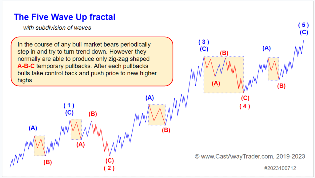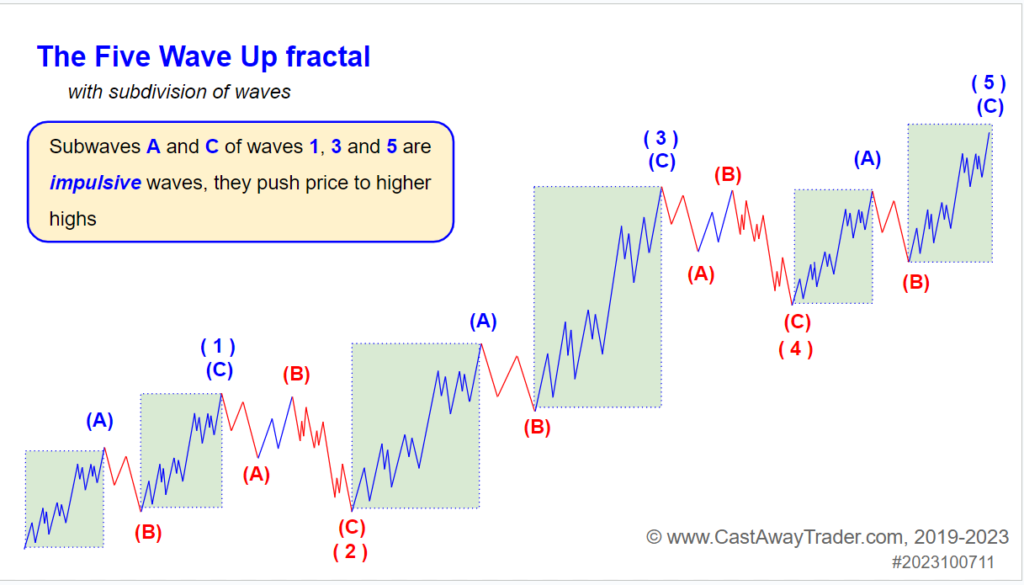 You can see that those moves that push price to new highs are colored in blue color. Traders who believe that price will get higher keep buying the asset and push its price higher. We call moves in the direction of the main trend that make higher highs in price impulsive waves. Impulsive waves are themselves structured as the Five Wave up fractal but of a smaller size. That means that if you zoom-in you will see that every impulsive wave is composed of five micro waves of smaller size.
