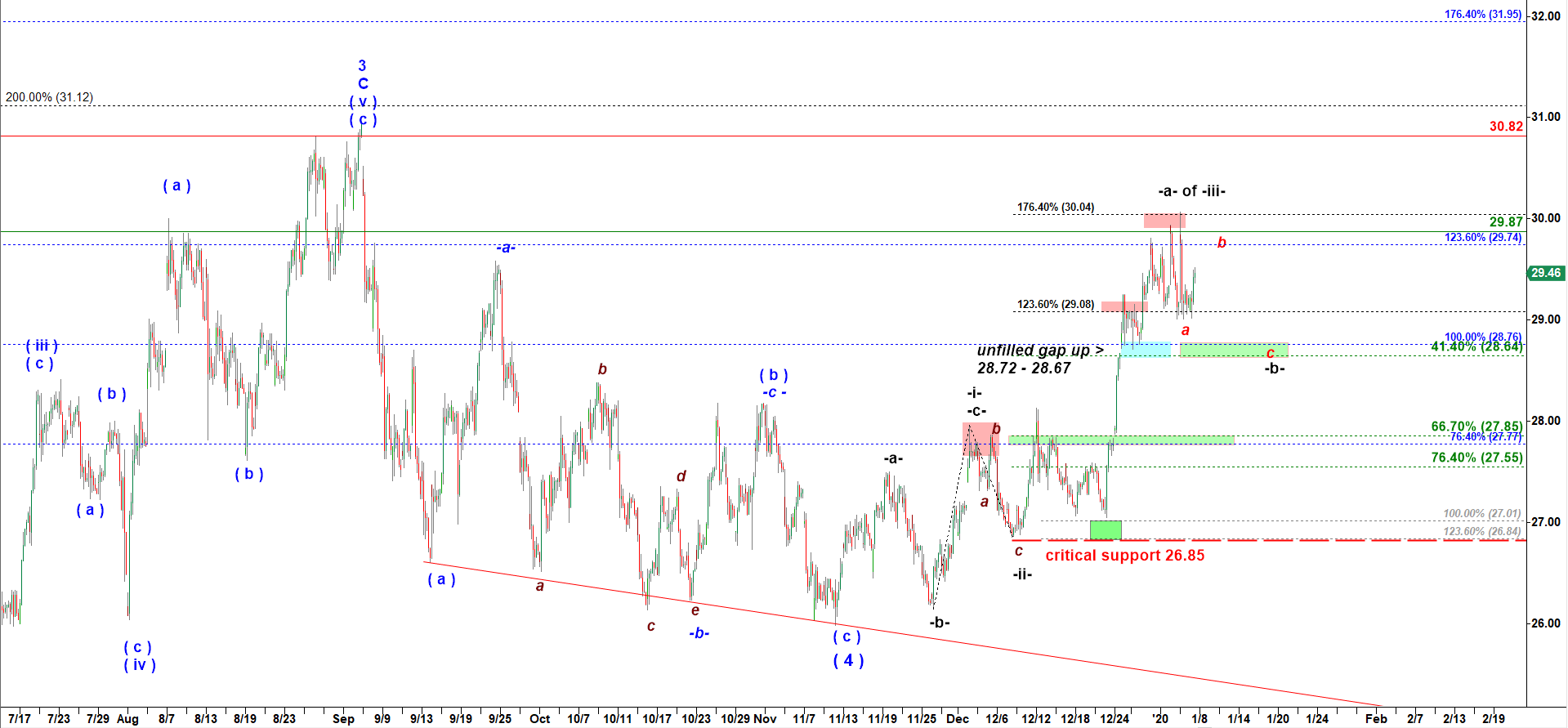 I think subwave -a- of wave -iii- up has topped and GDX keeps working on a corrective subwave -b- down.