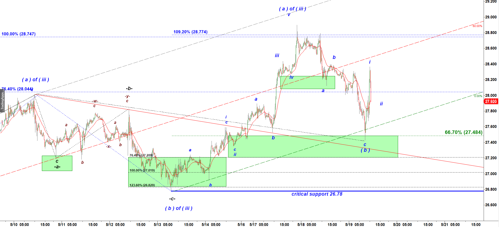 As long as silver holds over the morning low 27.425 we can consider it in an attractive i up – ii down long setup