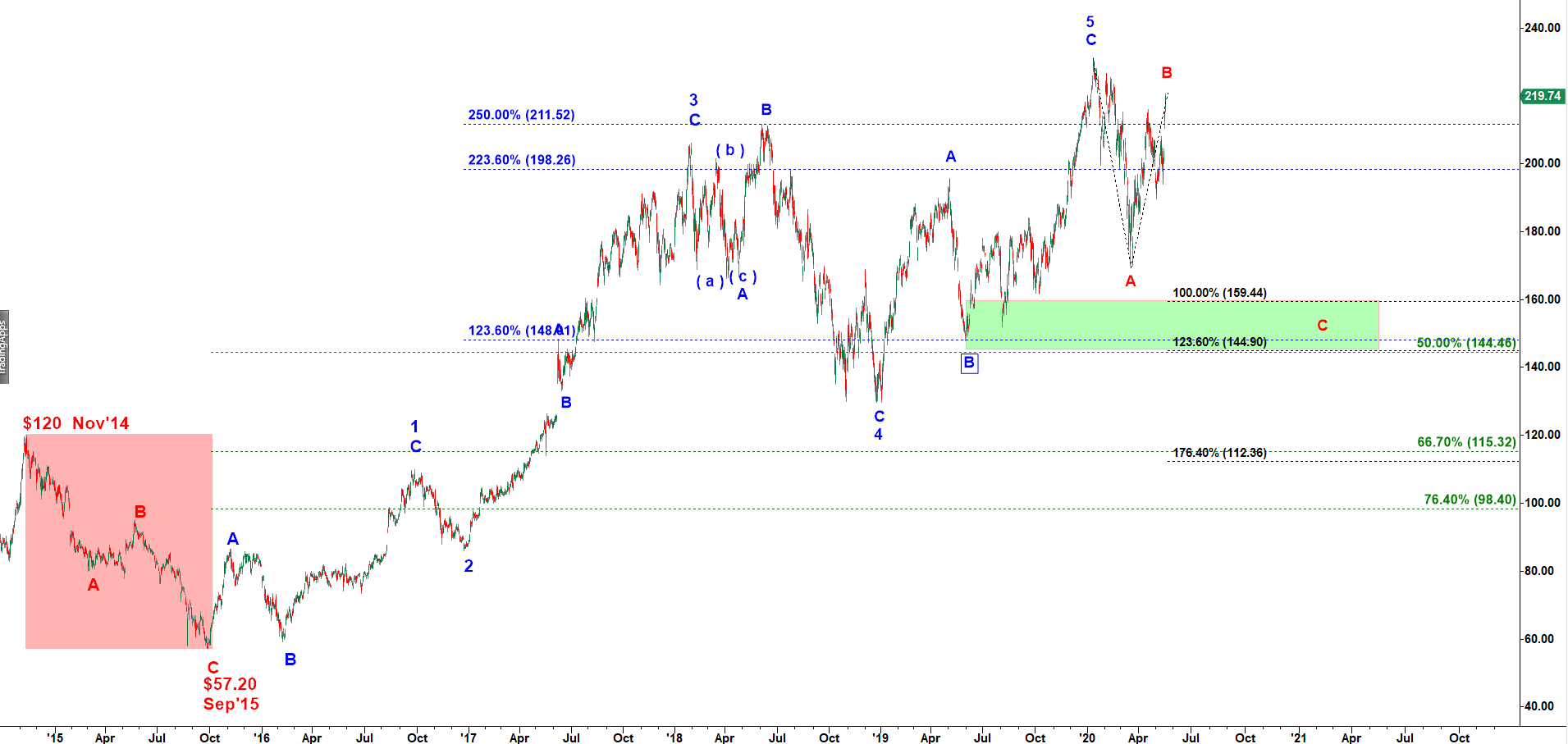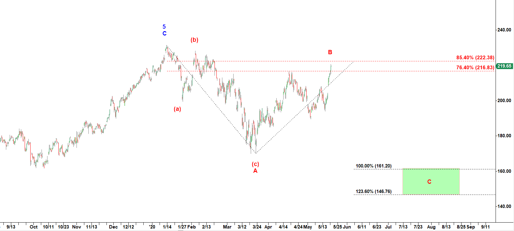 It topped in the final subwave C of wave 5 up at 230.18 in Jan 2020.