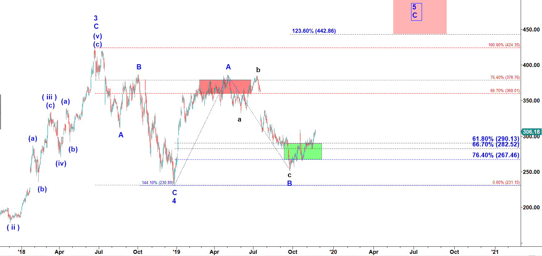 I have not changed this chart for weeks. NFLX dropped into the Green target box and then dropped a little bit under it. But since then it nicely recovered, left the Green Box and started its journey in subwave C of 5 towards a new all time high.