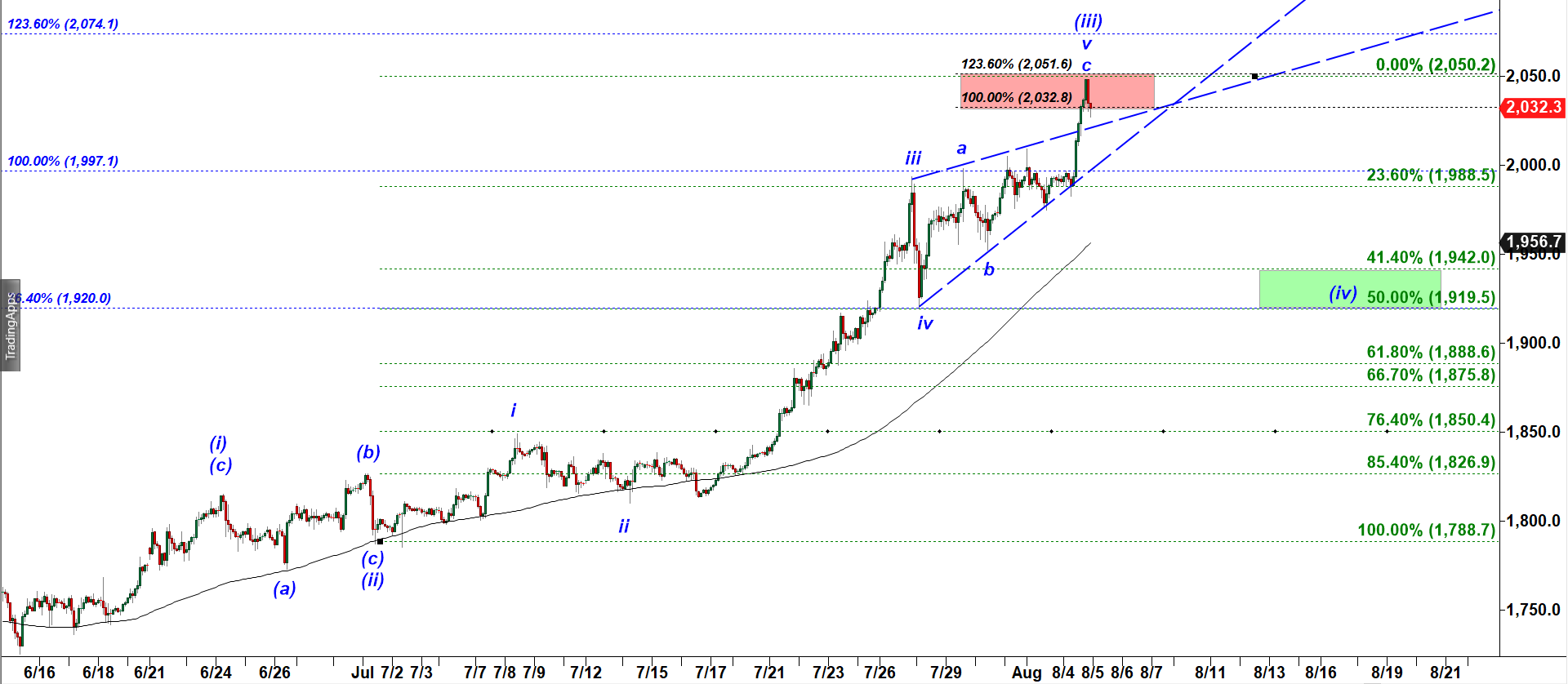 Gold may play a micro corrective wave -iv- down followed by another micro push higher in the micro wave -v- up before wave ( iii ) up gets completed.