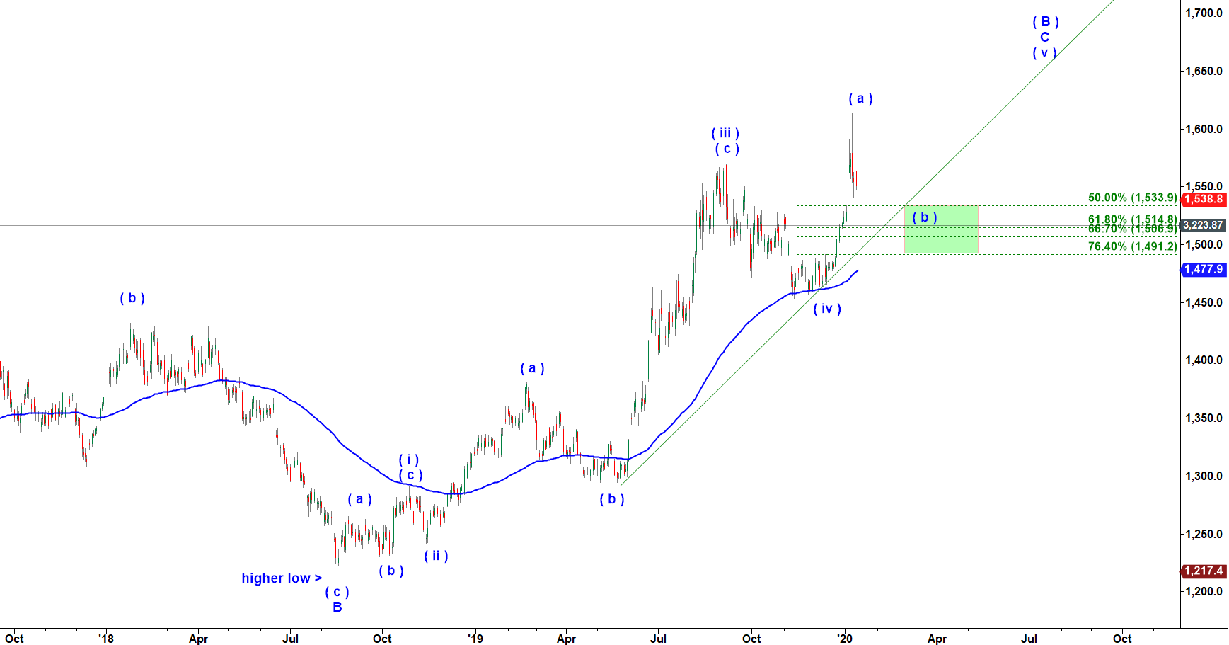 It’s difficult to forecast where the first leg down in subwave a of ( b ) down may stop. That 50% retracement at 1,522 may be strong enough to stop this decline and produce a corrective decline.