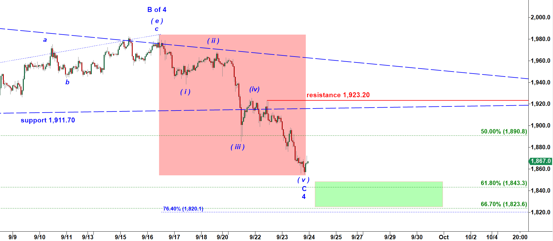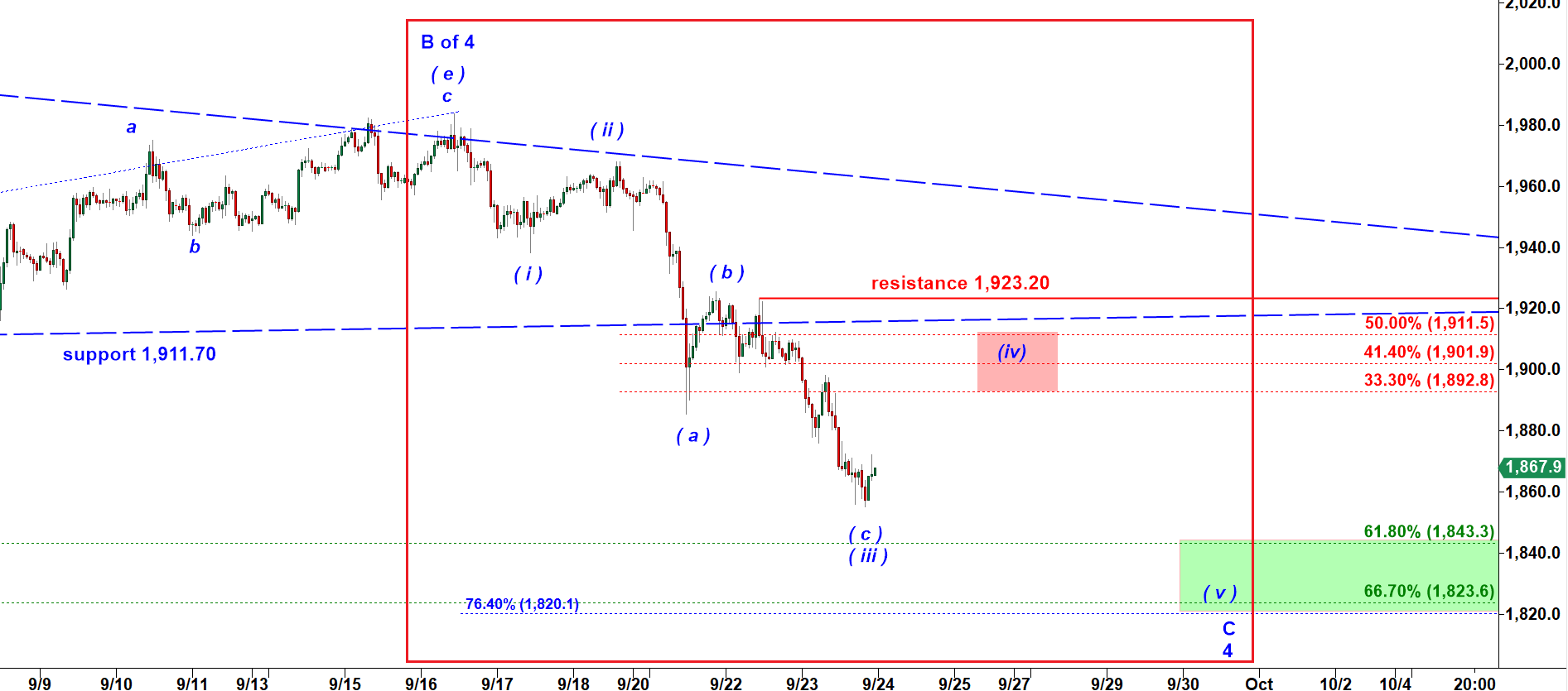 Bulls can prove that gold has bottomed if they violate resistance at 1,923.20. Until then we have to favor more bearish scenario where gold will push lower in wave ( v ) down after completion of a temporary pullback in wave ( iv ) up.