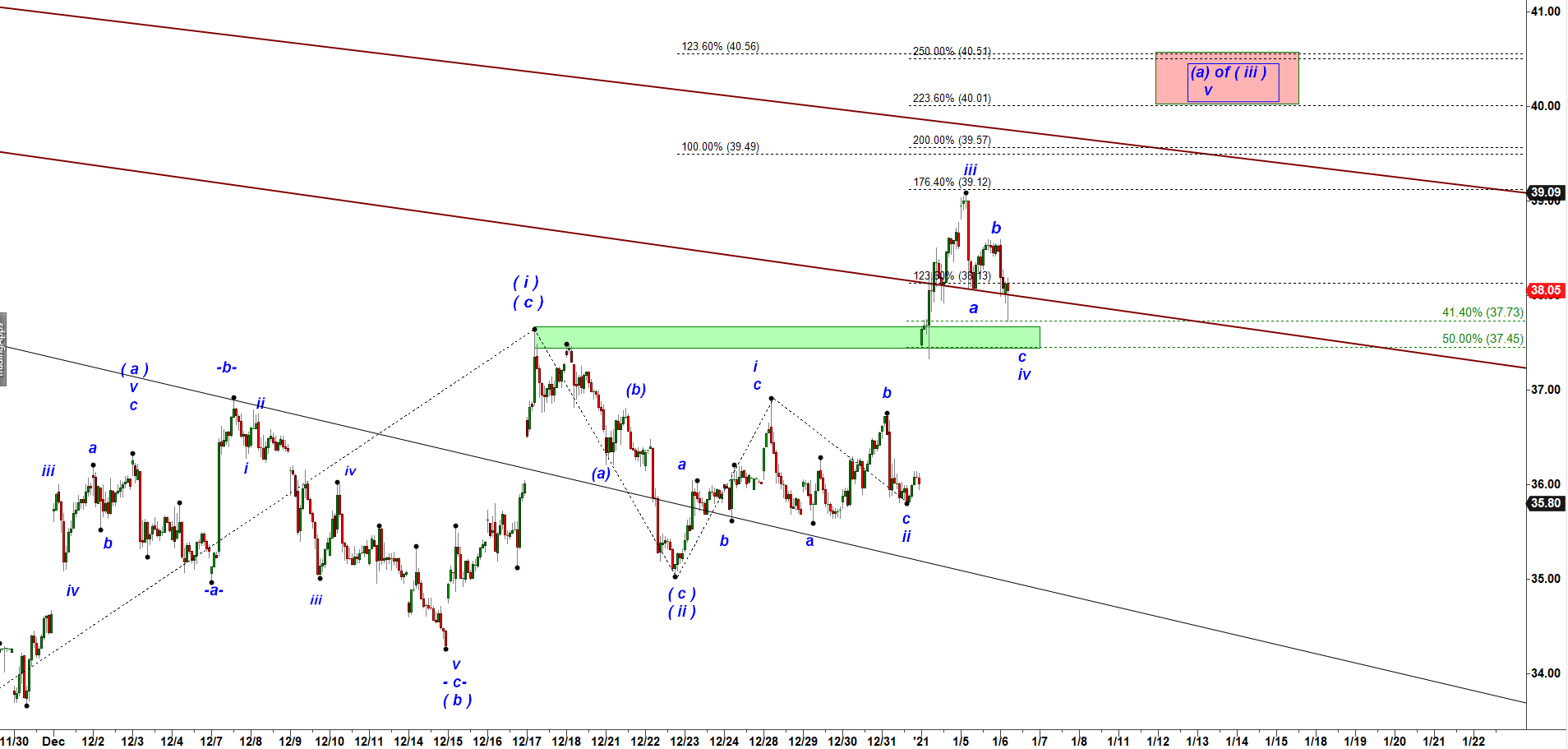 GDX is playing an a-b-c pullback in wave iv down to be followed by wave v up.