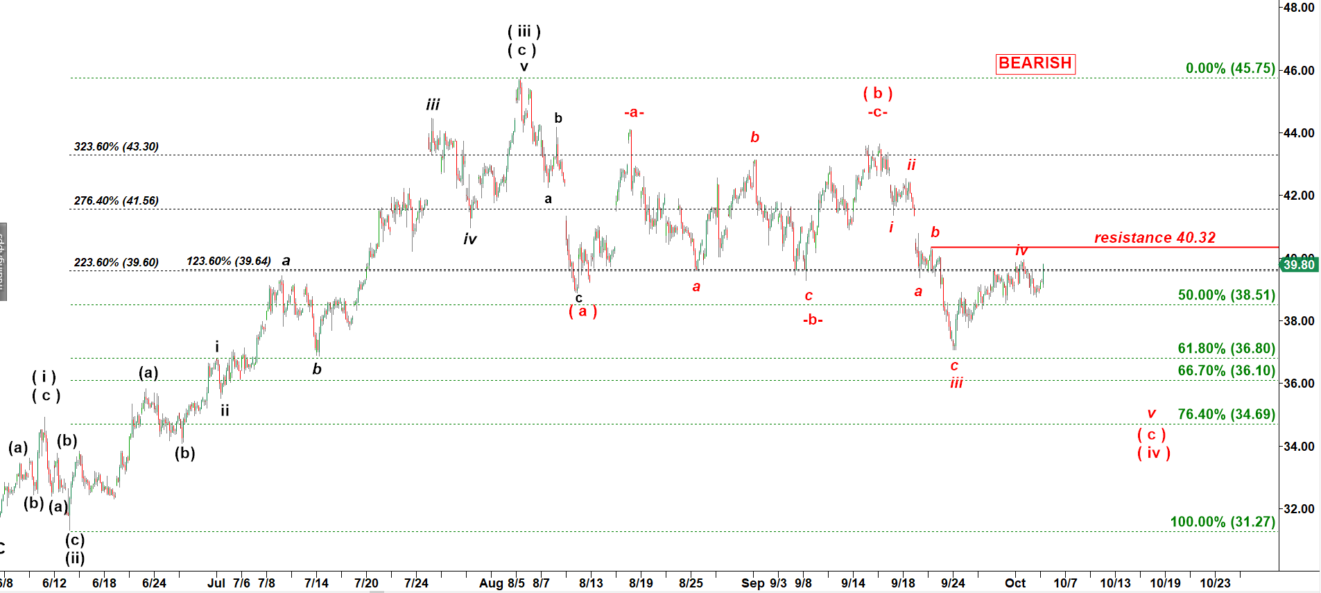 If bears manage to defend the resistance at 40.32 they will be able to drive GDX to one more lower low in wave v down.