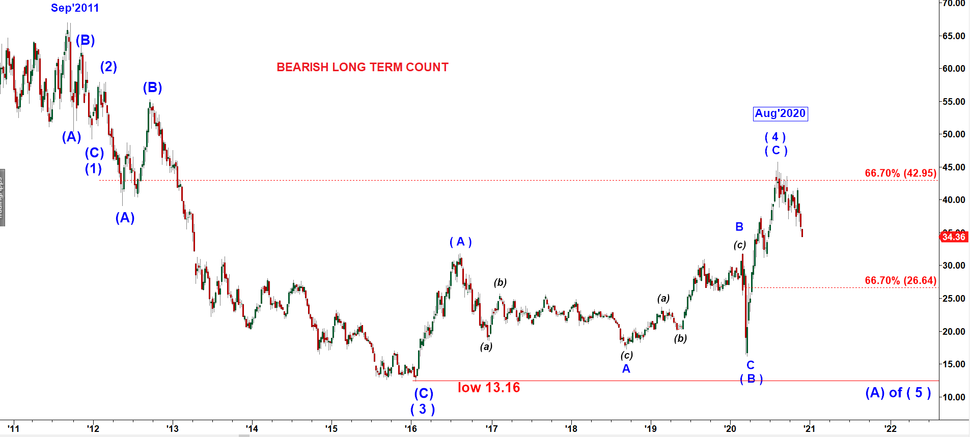 This is the only Bullish alternative count we have here. GDX is moving down in subwave (C) of a large corrective wave ( 4 ) down.