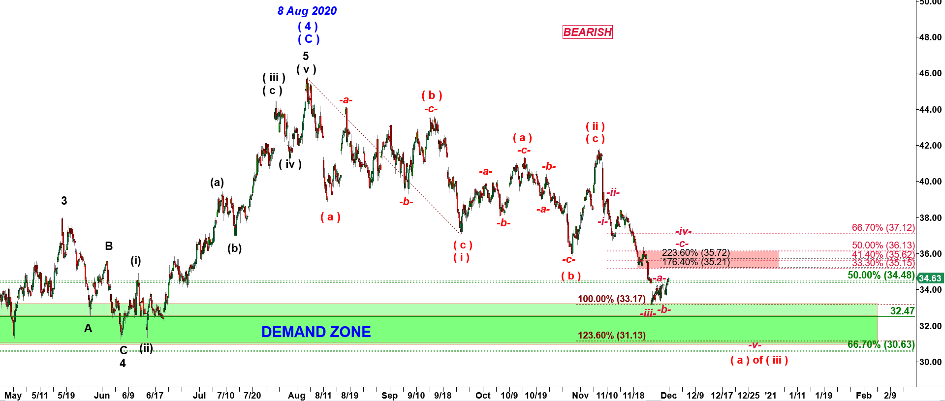 “GDX may extend to 31.90 – 30.90 before it can get a bounce in subwave (b) of wave ( iii ) down.”