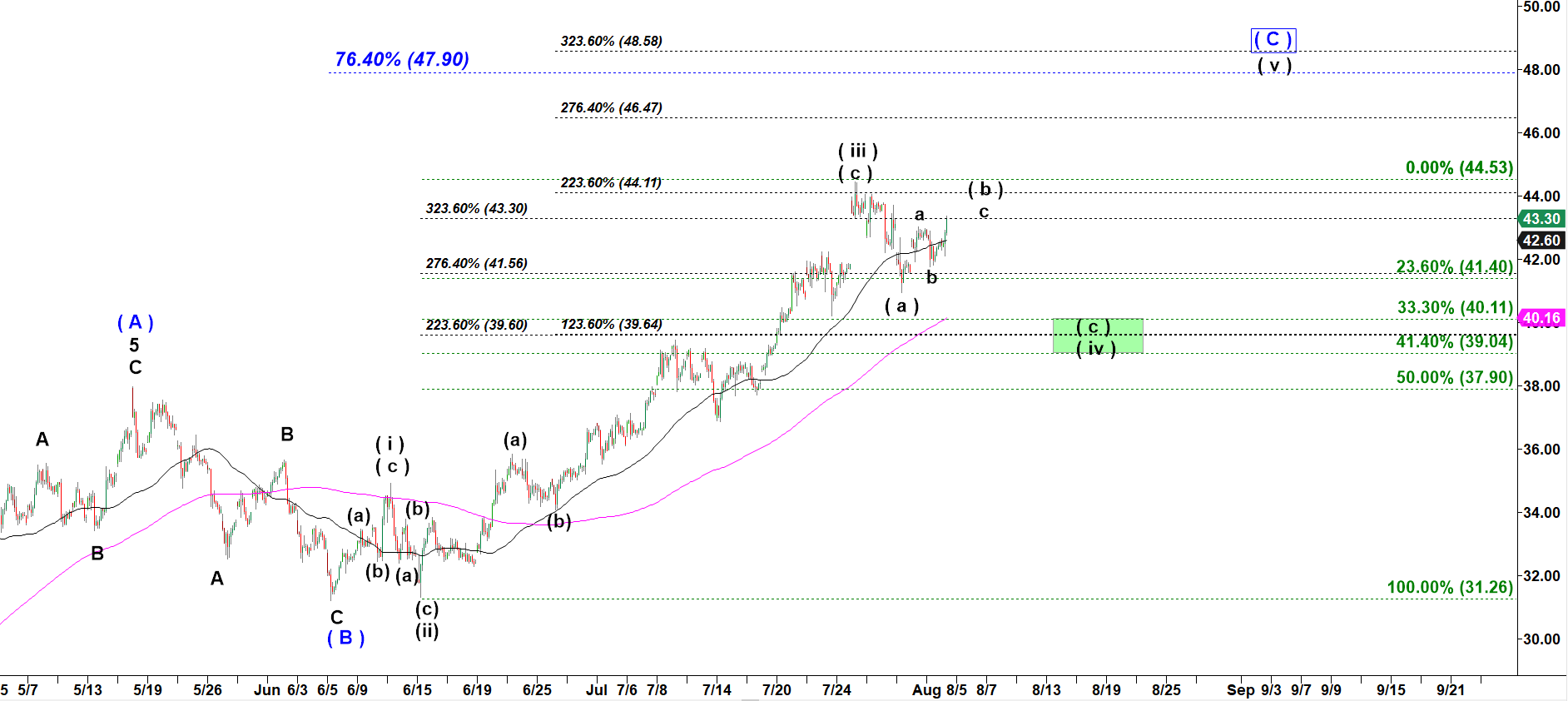 This is why it is so disadvantageous trade to short wave ( iii ) up. It can always extend with one more push higher. The much more prudent setup is to wait for a full corrective (a)-(b)-(c) down corrective structure of wave ( iv 0 down to go long to ride wave ( v ) up.
