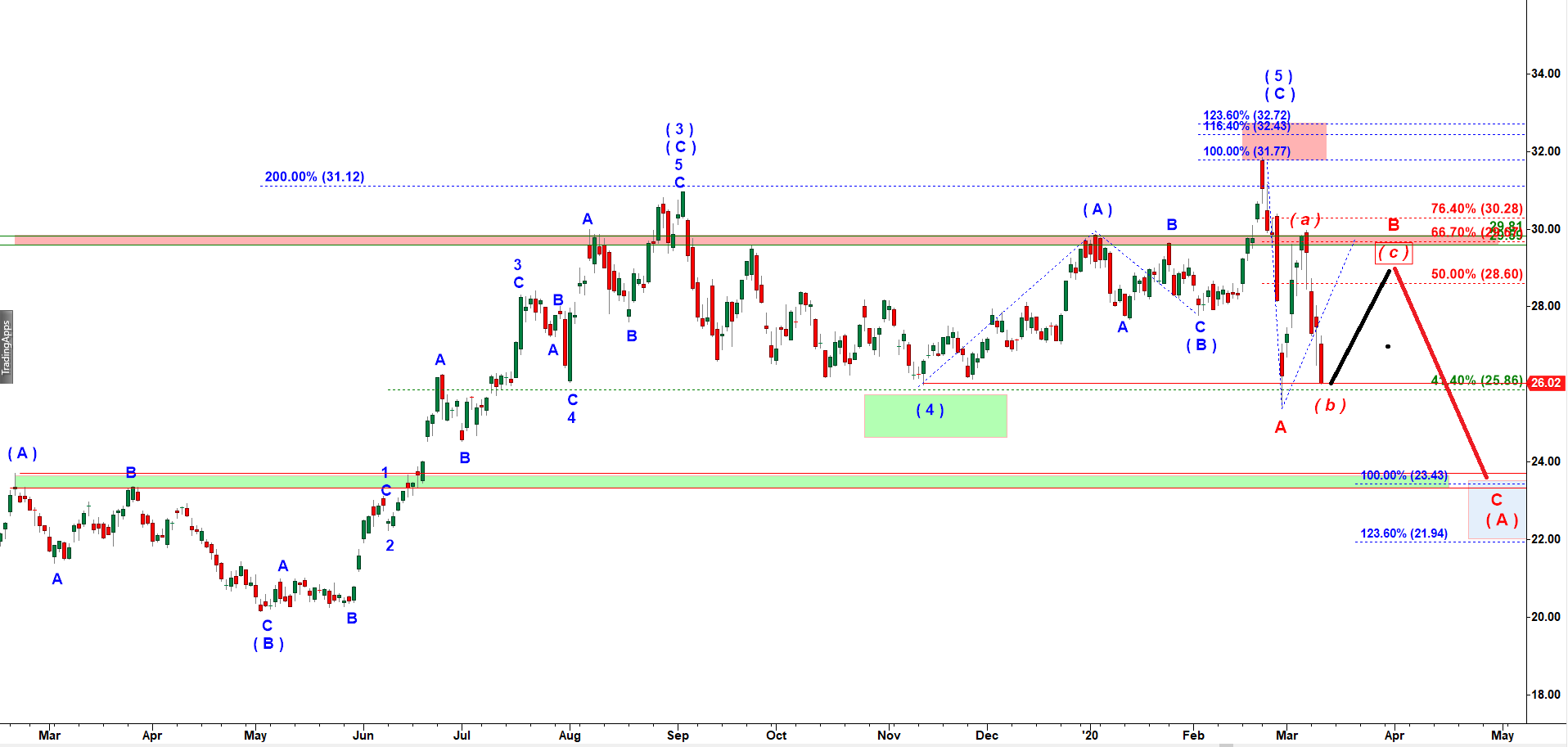 However, there is an alternative count. That alternative count is based on the concern regarding a micro structure of wave B up (the one that retested 30.00 resistance).