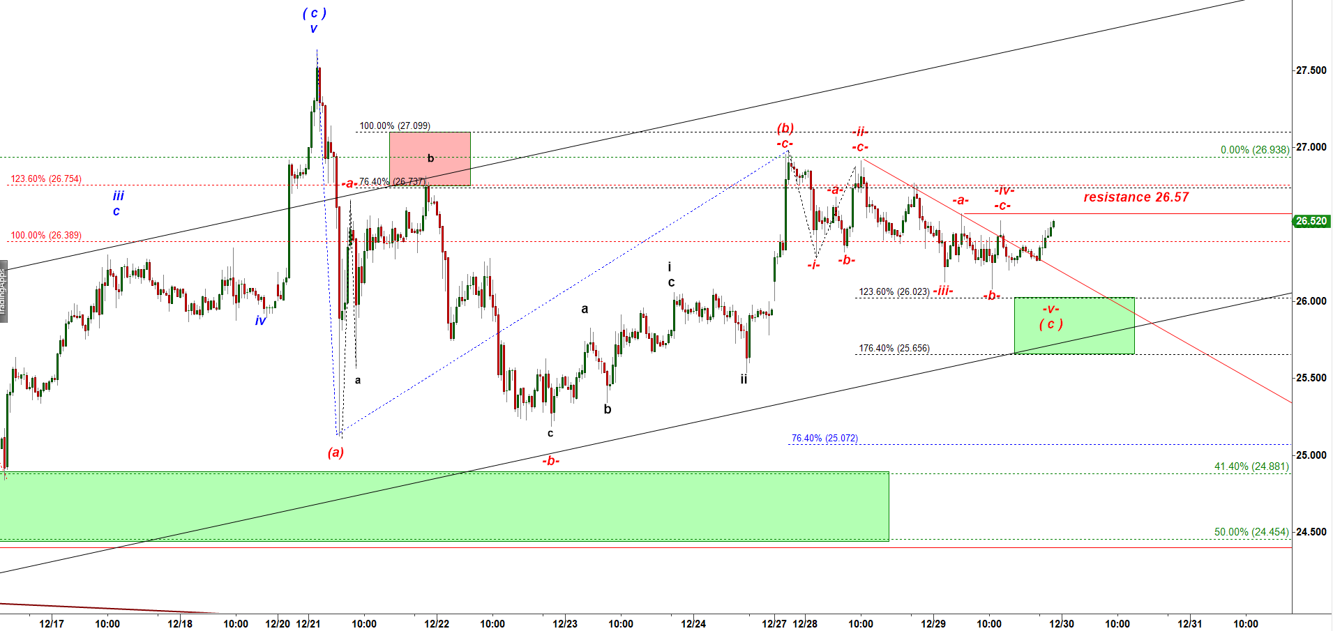 If bulls manage to push silver over resistance at 26.57 that would be a sign that a strong rally in subwave ( c ) of wave ( iii ) up has started.