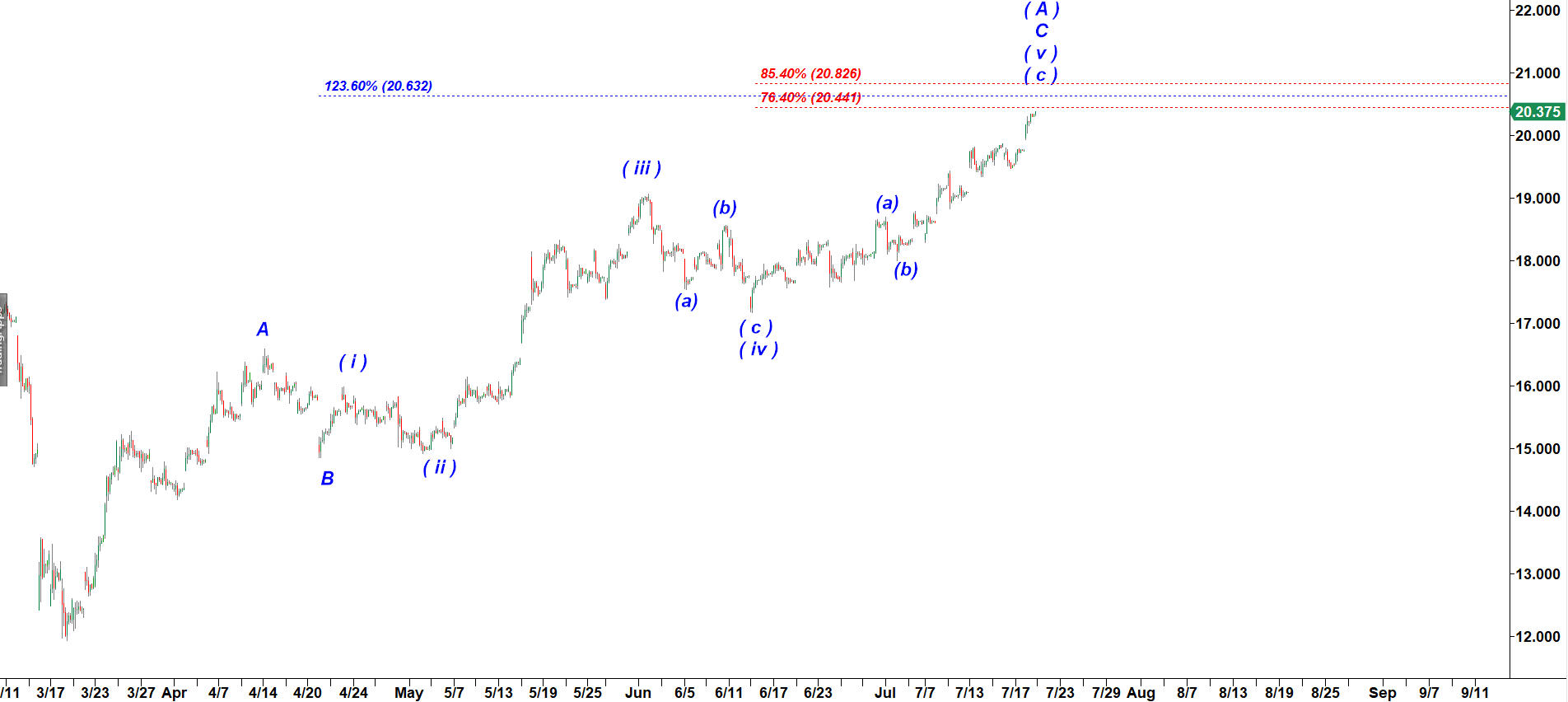 However, if we look at the micro structure of the rally, it looks very close to completion. That micro count suggest silver topping at 20.83 at max.