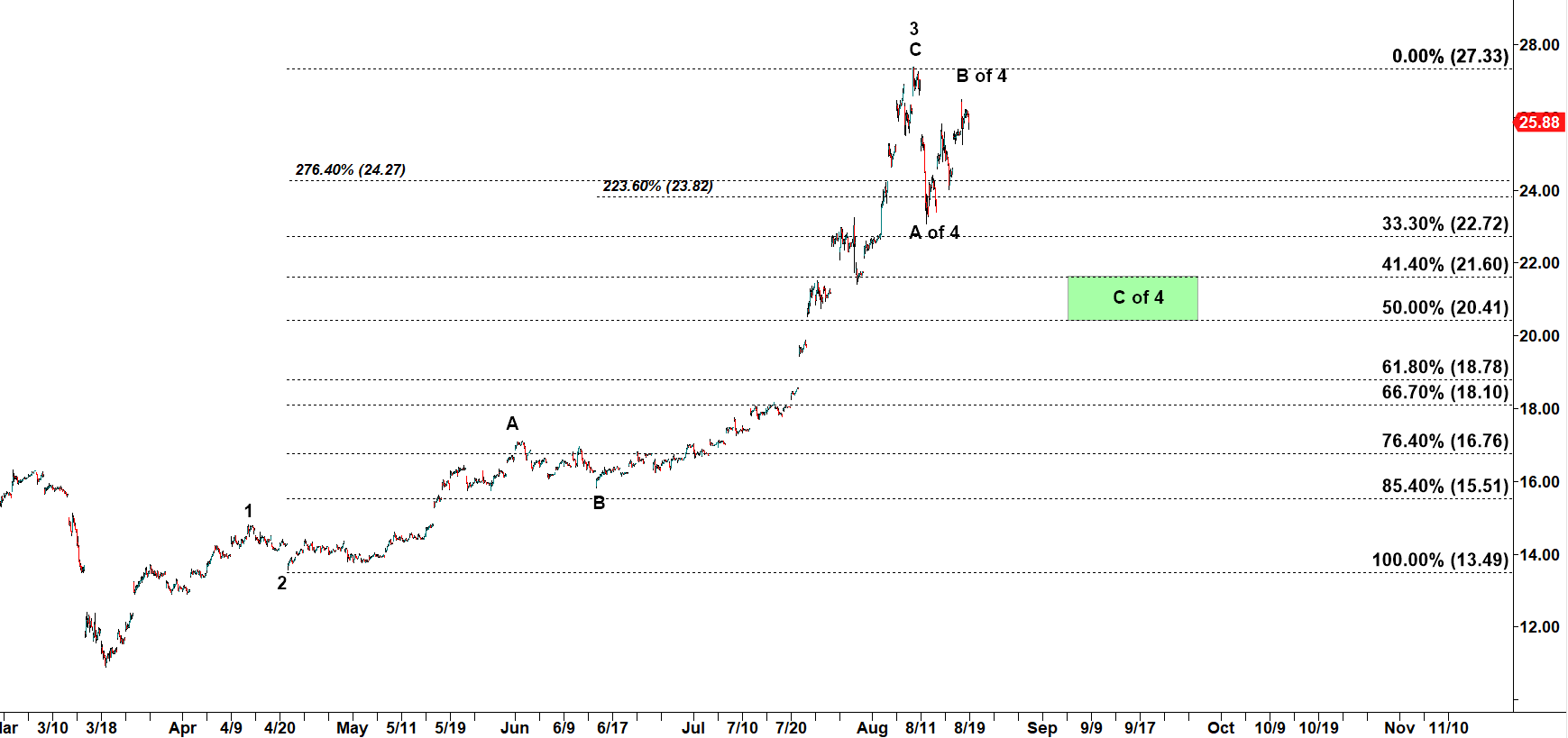 Subwave C down should target the Green Box that starts at 21.60 ( 41.40% retracement).