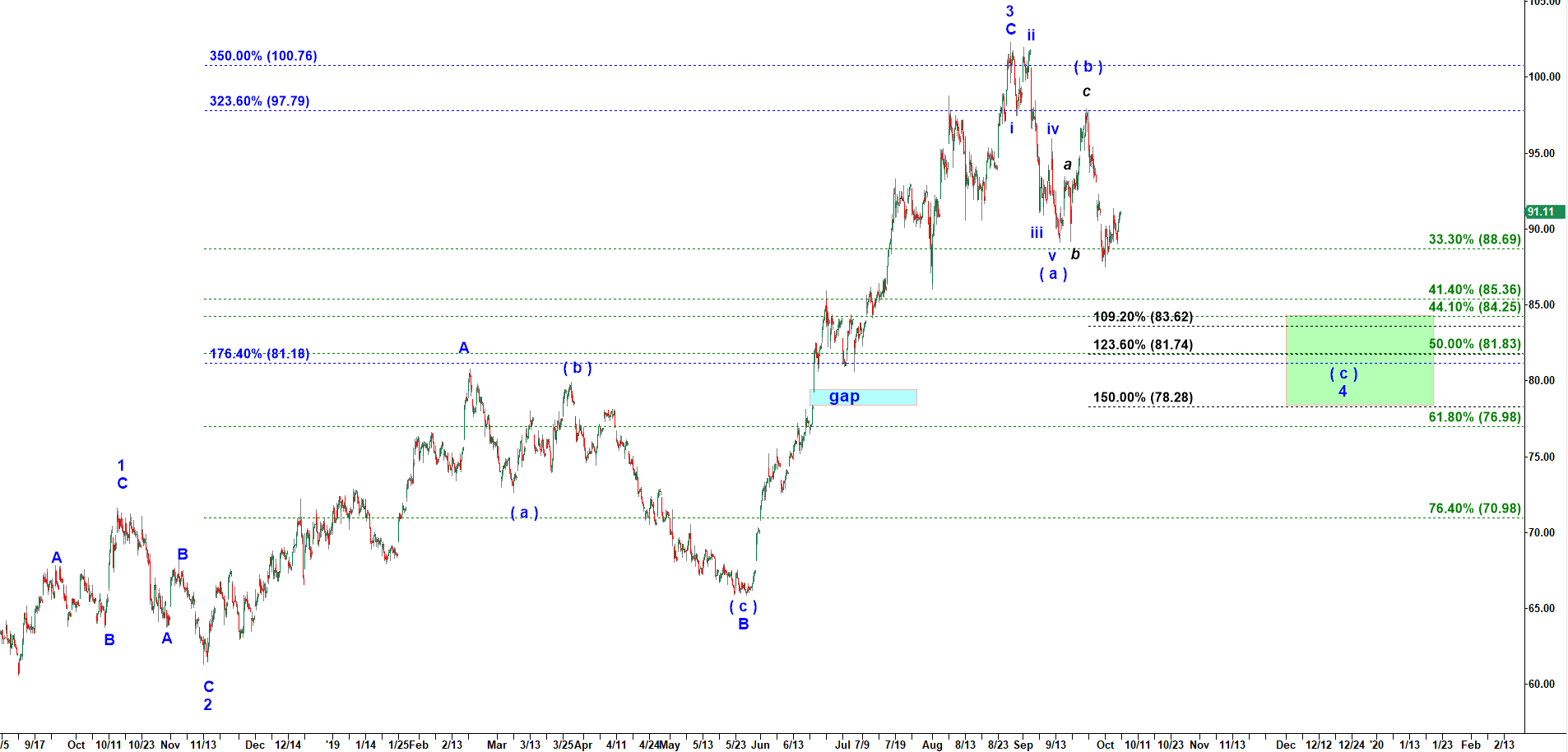So far we can see a textbook looking corrective (a)-(b)-(c) move down off the top made by wave 3 up.