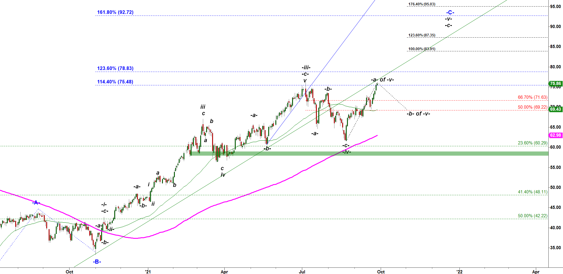 This strong rally should be subwave -a- of wave -v- up that should hit resistance at the high made by the previous rally (76.22).