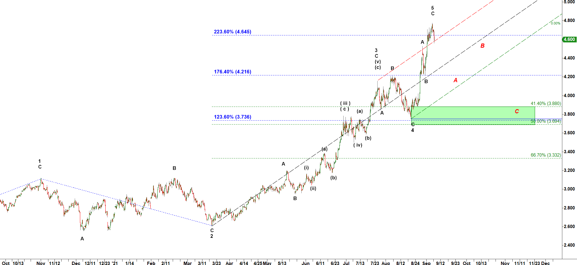 The top made by NGV could be either wave 3 up or wave 5 up and in either case a large A-B-C down pullback targeting 3.900 should follow.