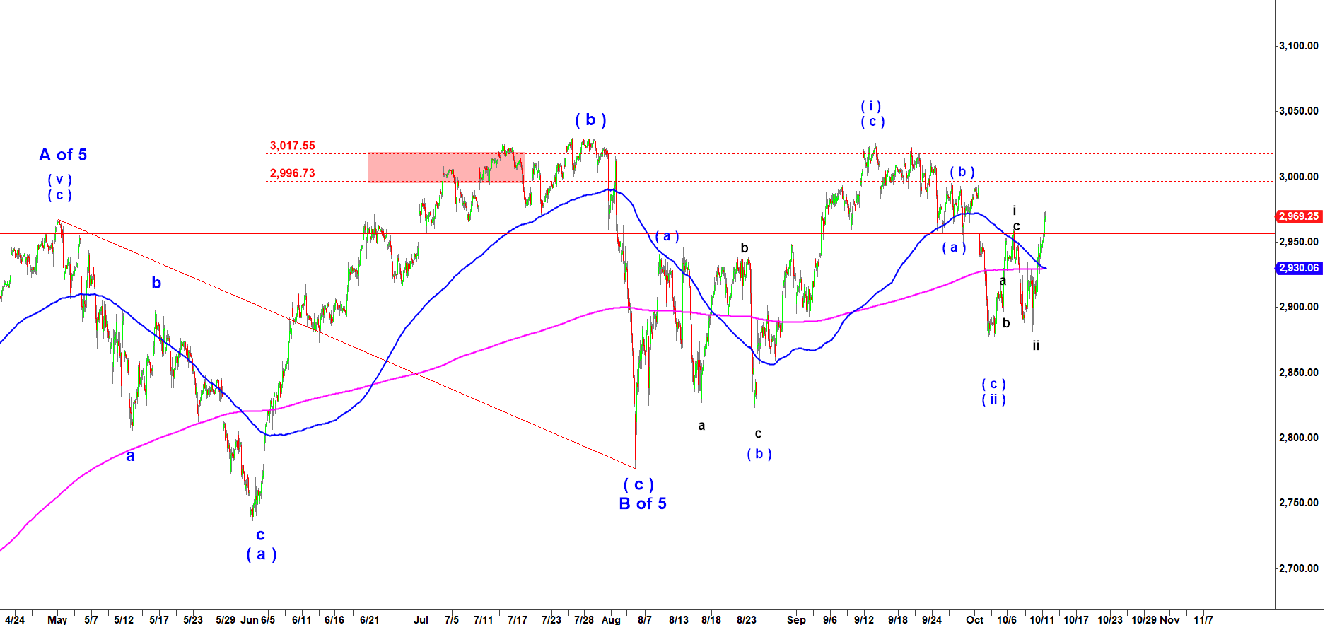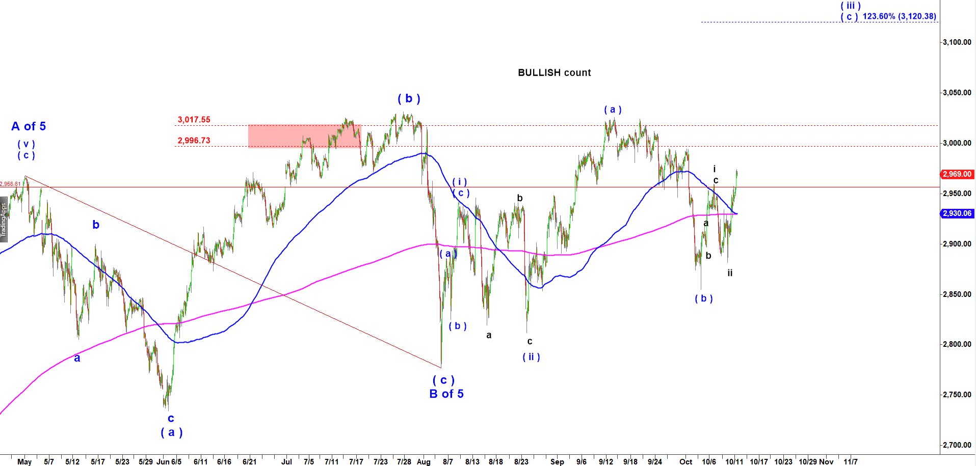 The one below I call “Just Bullish” because it suggests that part of the rally has been already completed in wave ( a ) of ( iii ) and ES is starting the strongest part of the rally in wave ( c ) of ( iii ). Even under that less bullish scenario, that current ( c ) of ( iii ) up may stretch to 3,120-3,230. Both scenarios point higher to new all time highs. The main difference is the ultimate target for wave C of 5 that will complete the 10 year old bull market.