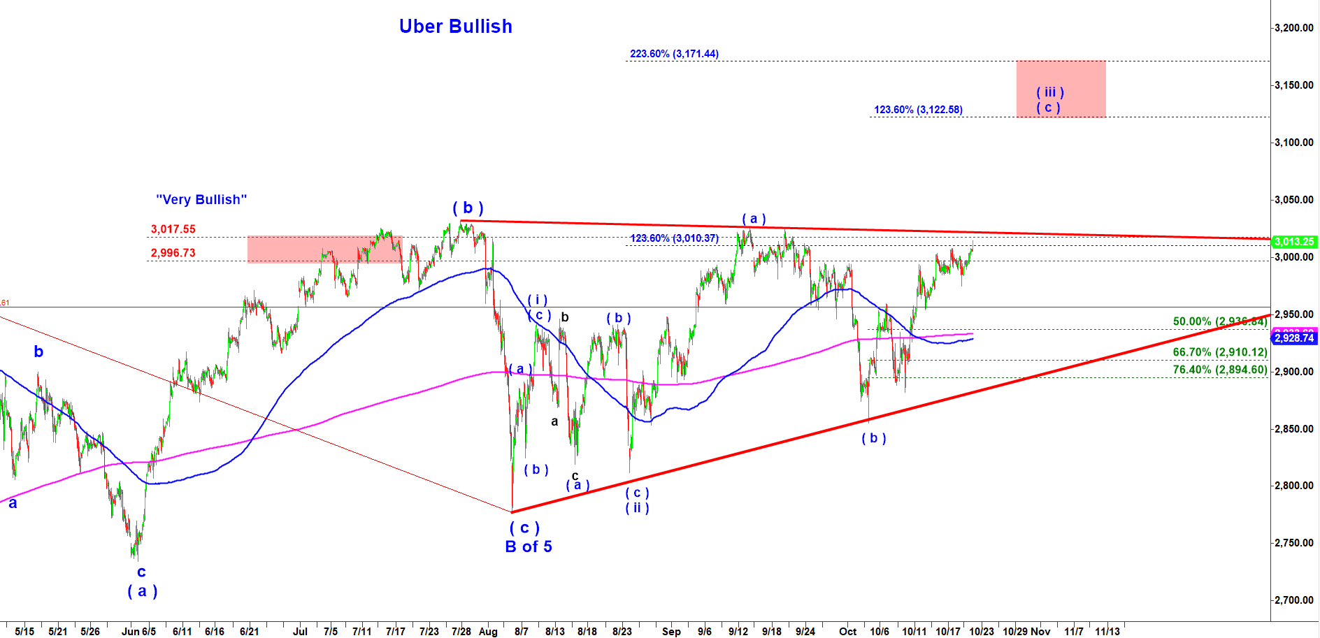 Here we have two alternatives. If we get a strong move up over 3,020 preferably with a gap up then that would be a sign that the Very Bullish count is in play. Under that count ES may quickly run over 3,100.