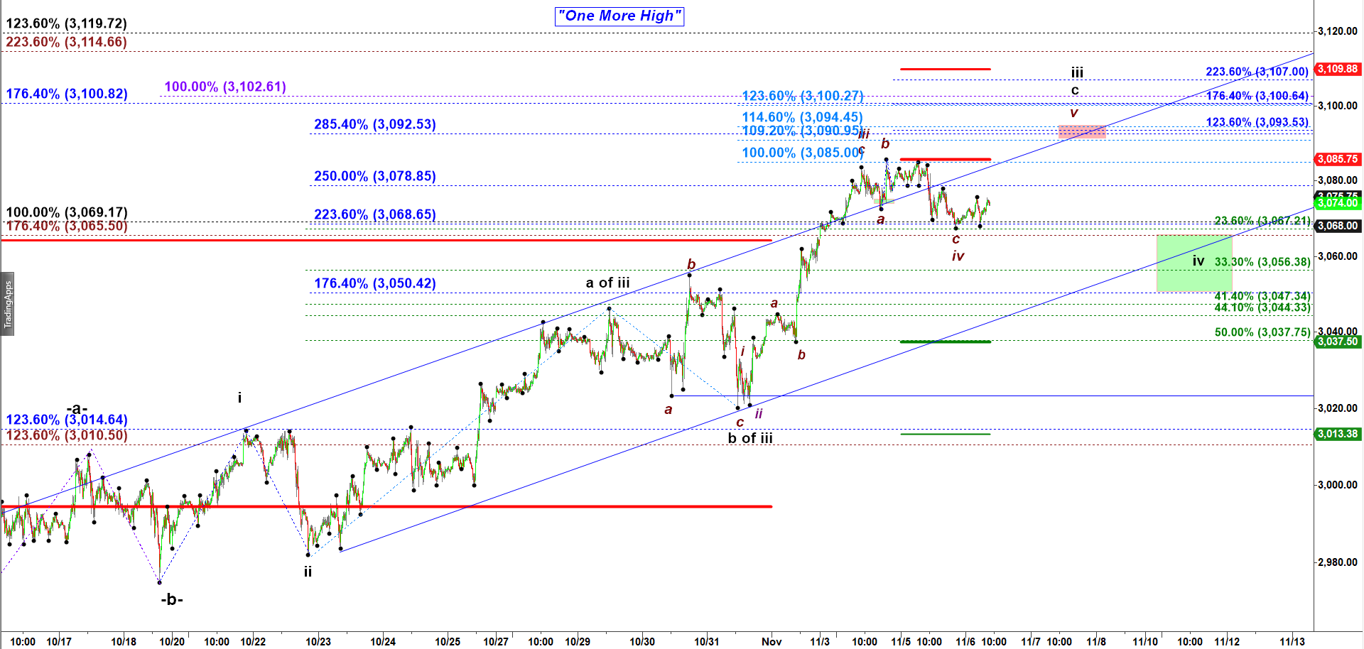 The bullish one is the one we have been watching for a while (see below). It suggests one more push higher at least to 3,090.