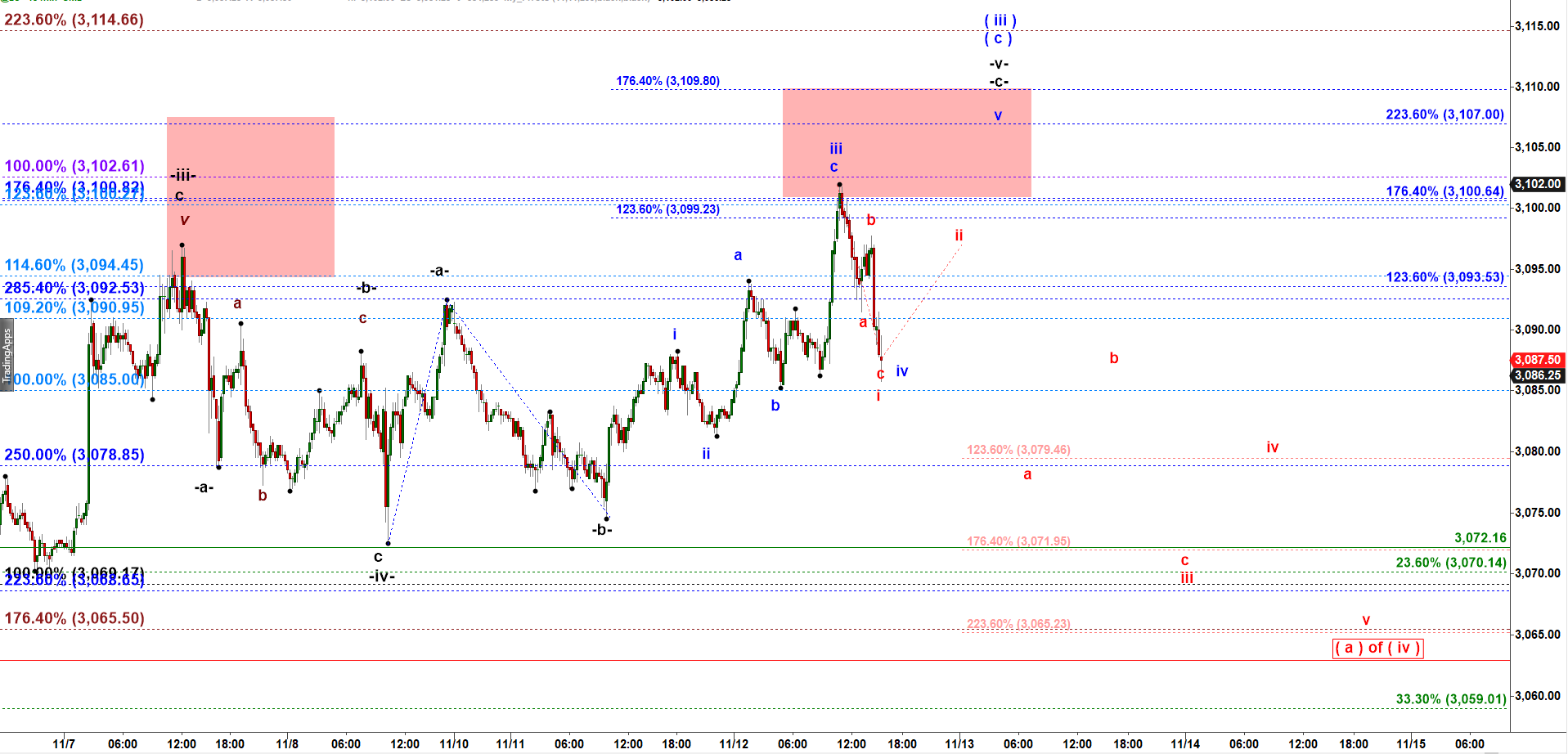 Technically speaking it still holds potential for one more higher high in a micro wave v up ( the blue count).