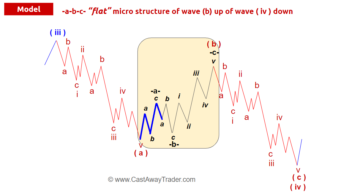 Let’s first look at the Model fractal. We saw a sharp a-b-c drop that was deep and scary enough to be all of ( a ) of ( iv ) down. That was the first leg of a corrective move down. Now everyone and his dog want to re-short. That is why a corrective wave ( b ) up does not come as a quick pullback.