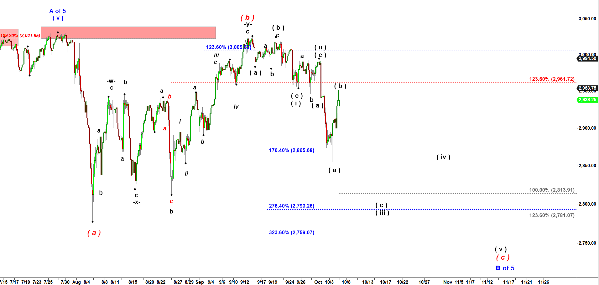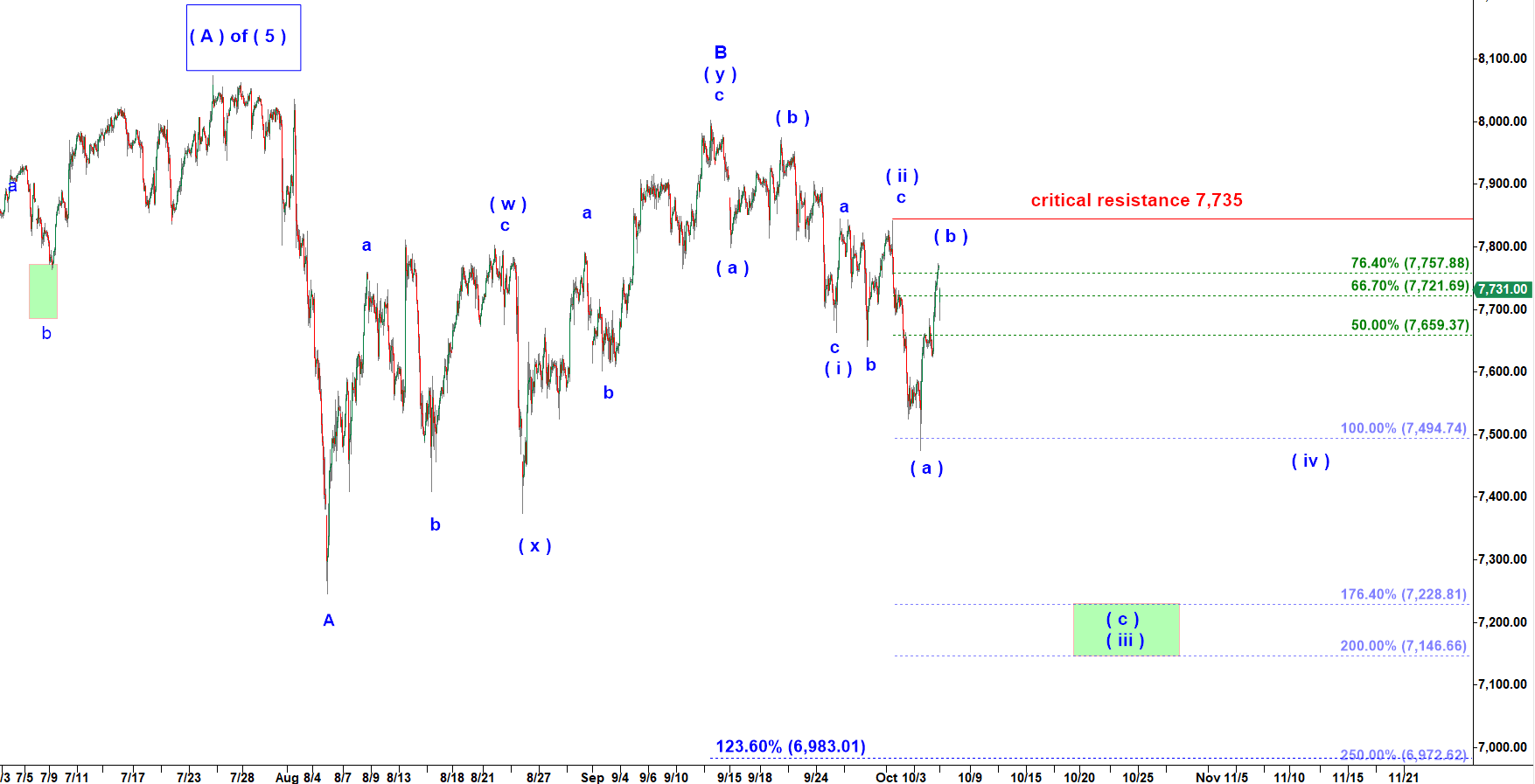 I have the very same bearish count for both NQ and ES futures. Under that bearish scenario I count the move up into the top made last Friday as a corrective wave ( b ) of ( iii ). And off that top I expect an impulsive decline in subwave ( c ) of wave ( iii ) down.