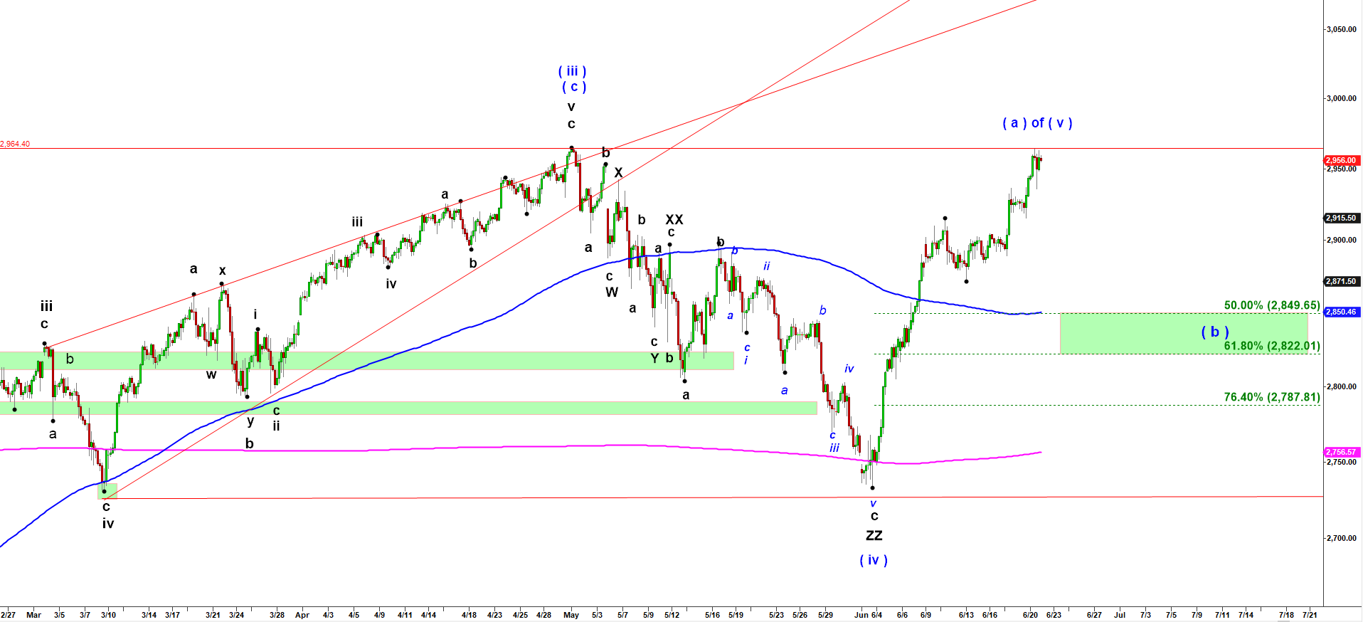 The Model Five Wave Up fractal aligned with ES-mini as of 6-20-19