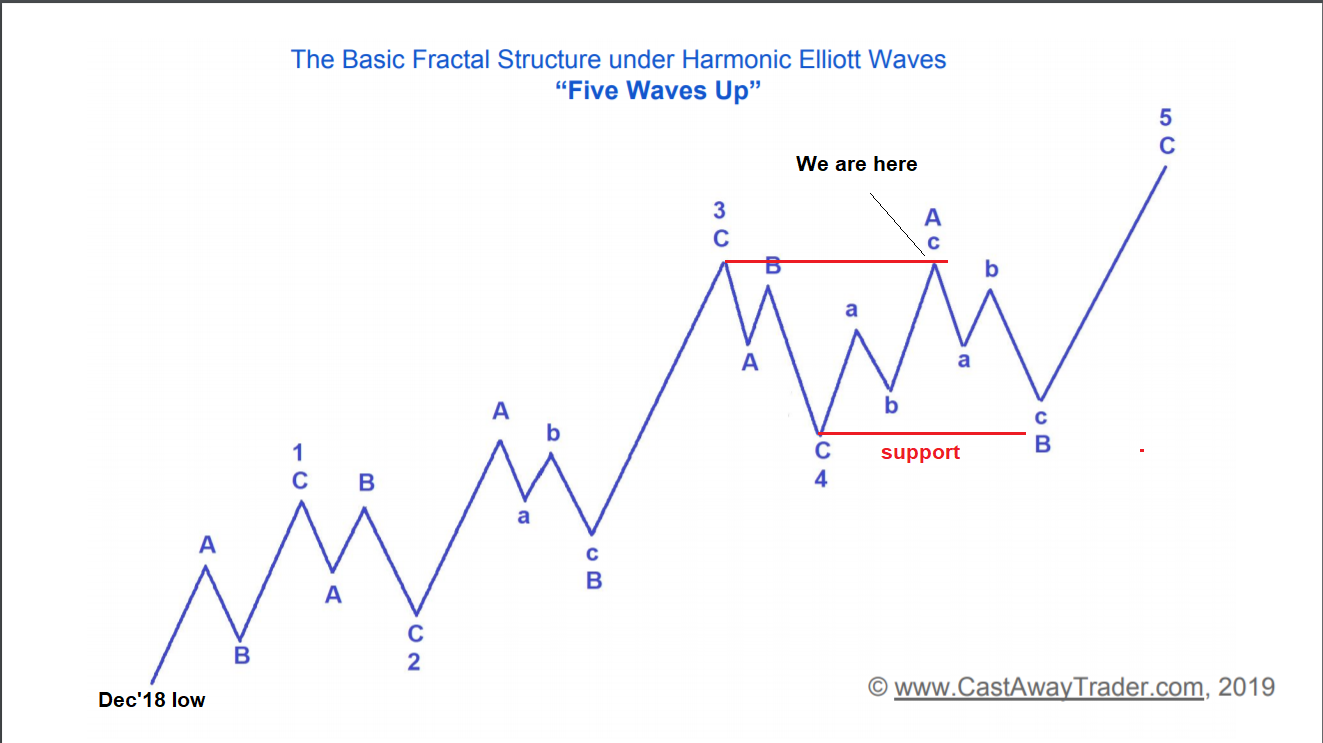 And below is the model of the Five Wave Up fractal as aligned with ES mini / S&P. According to this count the rally started off the low in Dec’18 has not yet completed.