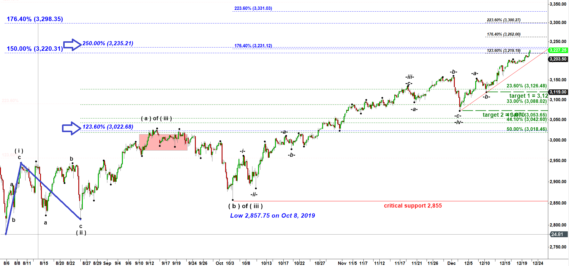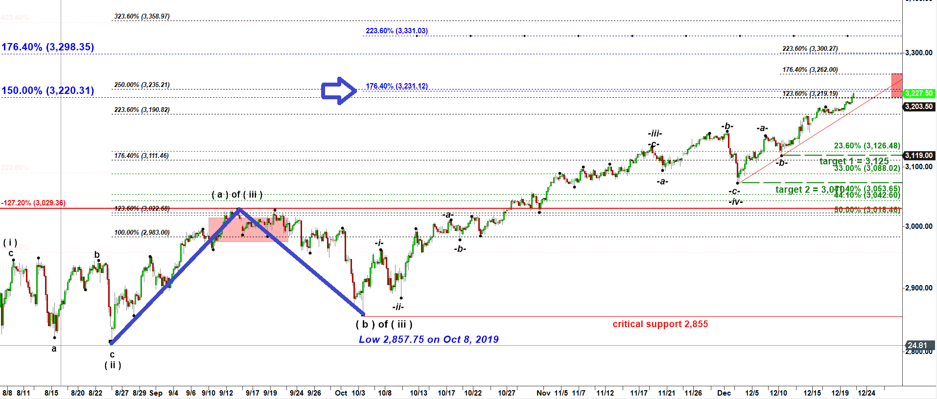 It is about to hit an important cluster of two extensions. First, wave ( iii ) = 250% of wave ( i ) up = 3,235.
