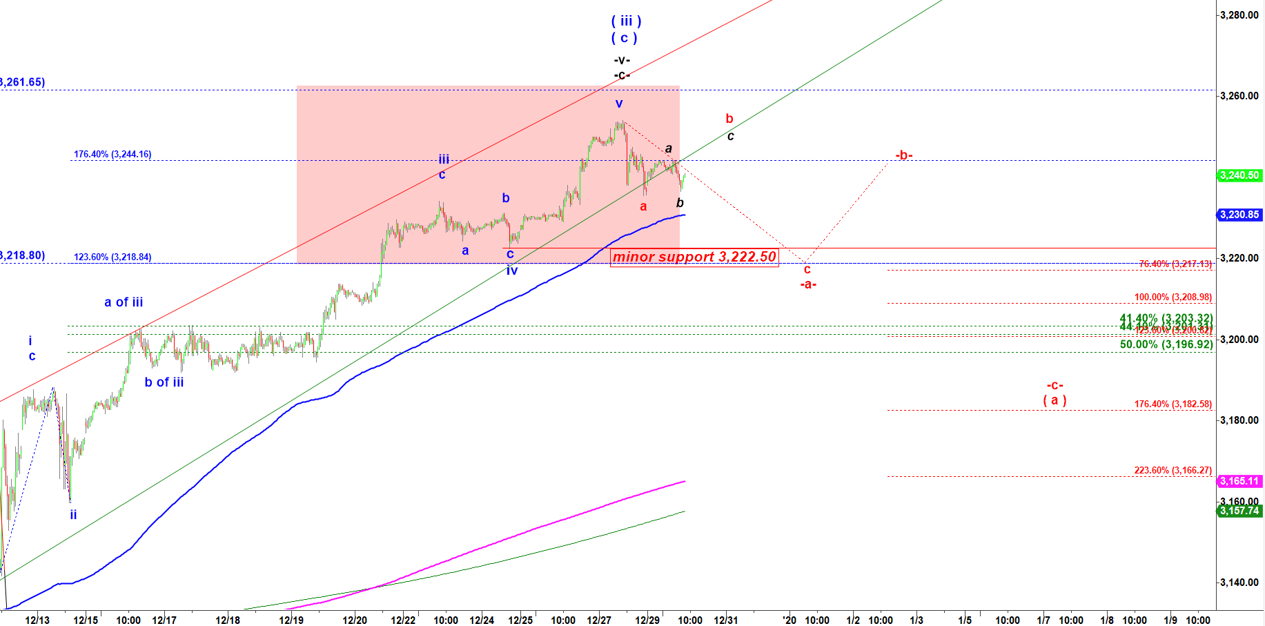 When a stock breaks under a trendline it normally comes back up to retest that trendline from below. Only after that failed attempt to rally making a lower high the stock starts a stronger move down. We keep waiting for a better confirmation of completion of the wave ( iii ) up. That should be a violation of the low made by previous corrective wave made at 3,222.50.
