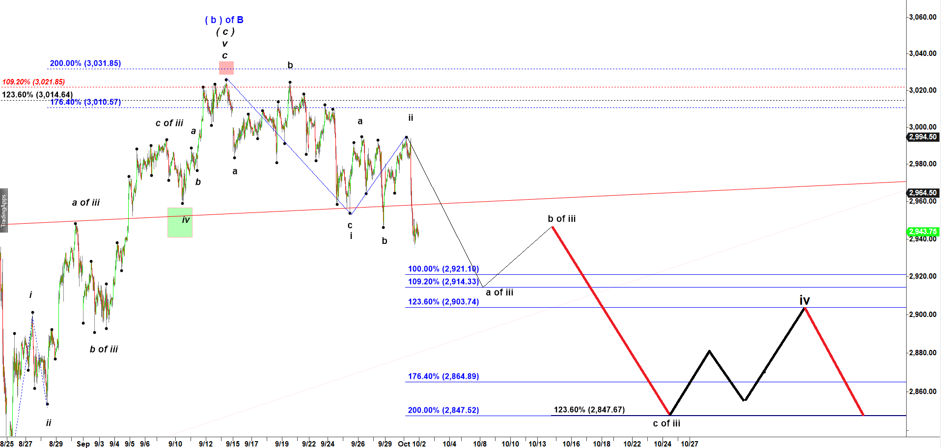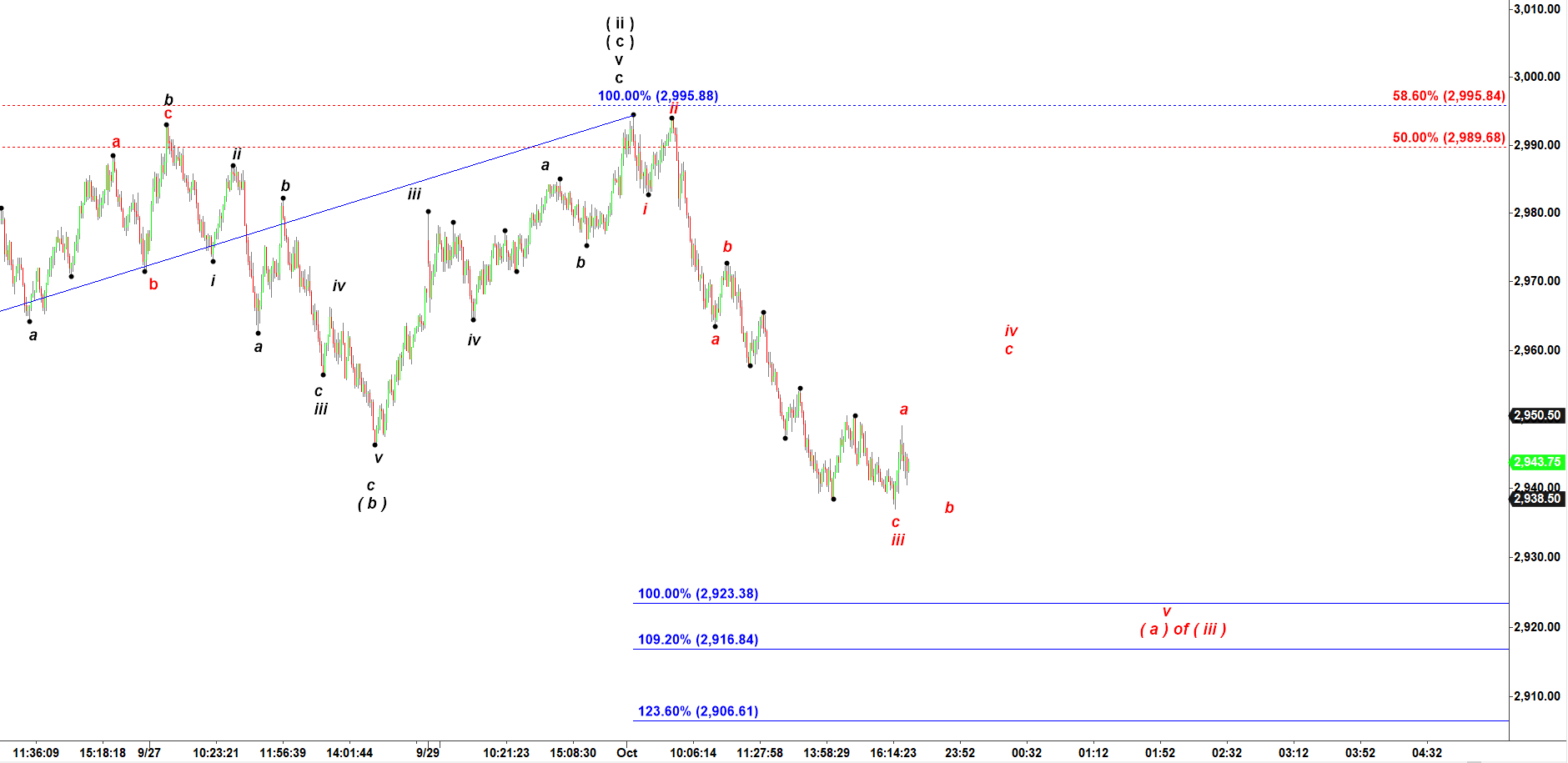 On the chart below you can see a micro structure of this subwave a of iii. That subwave a has be composed of five waves of lower degree. It seems like teh micro wave iii has finally bottomed and ES is working on a corrective pullback in a micro wave iv up,. After that pullback we should get another push lower in a micro wave v down that may push price to 2,920-2,900.