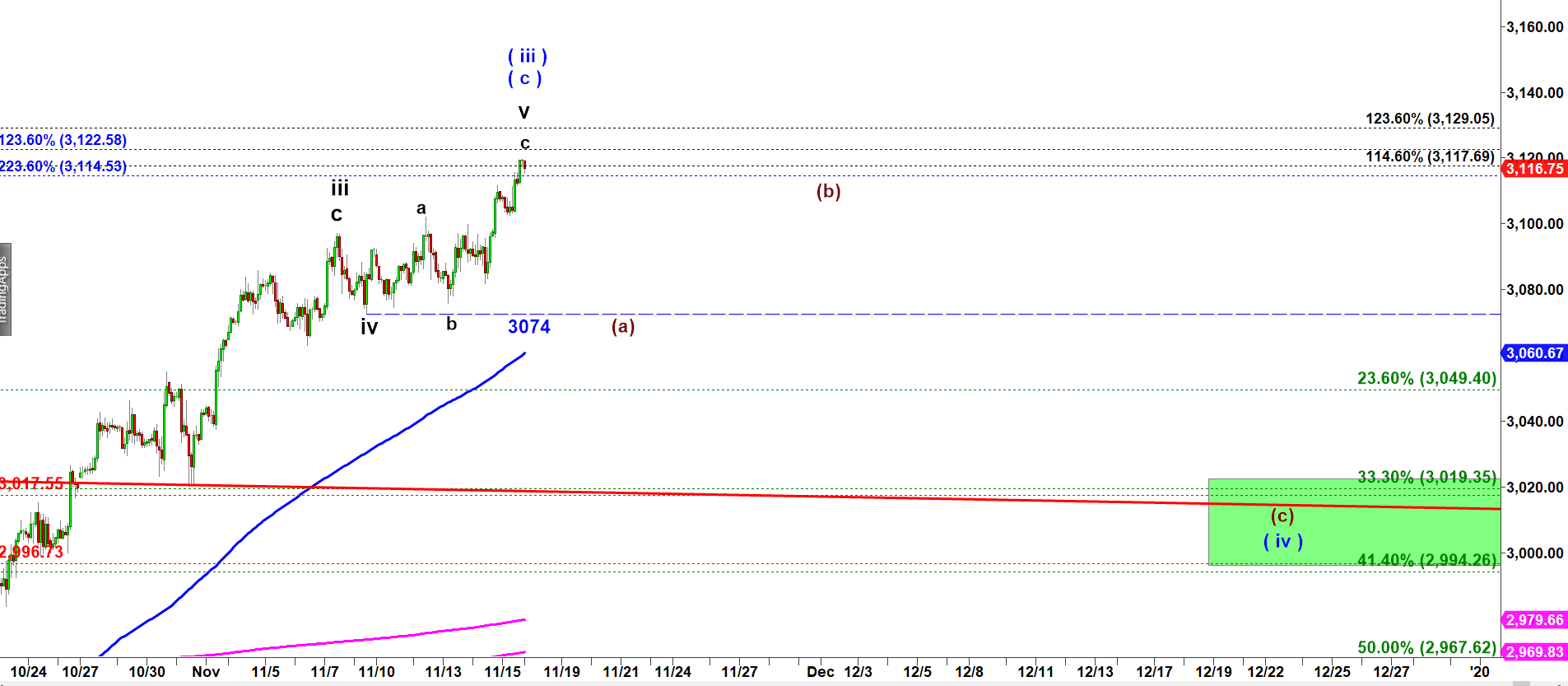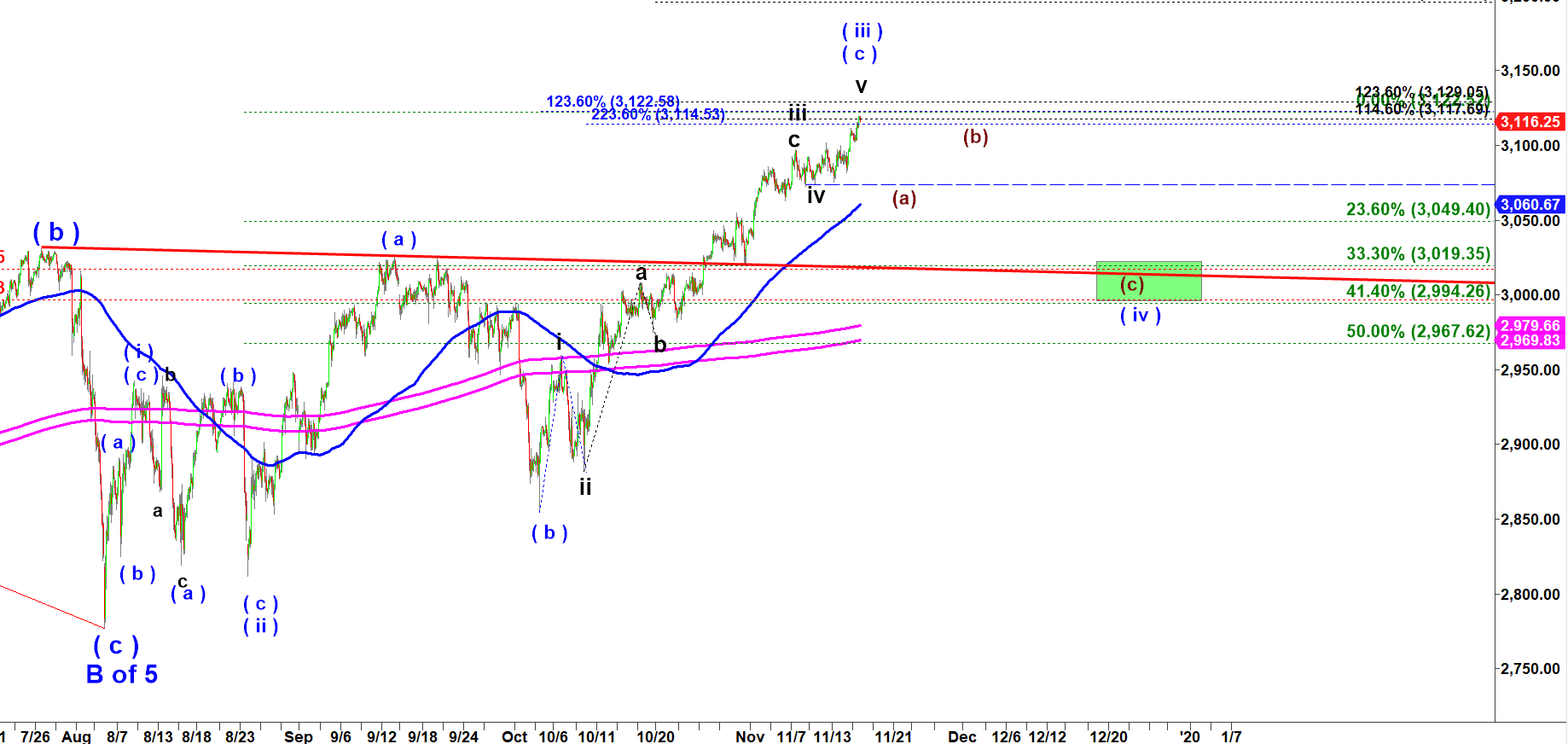 The micro support remains the same, 3,102. It has to break under that level to signal completion of the last micro rally in subwave c of v of a larger degree ( c ) of ( iii )
