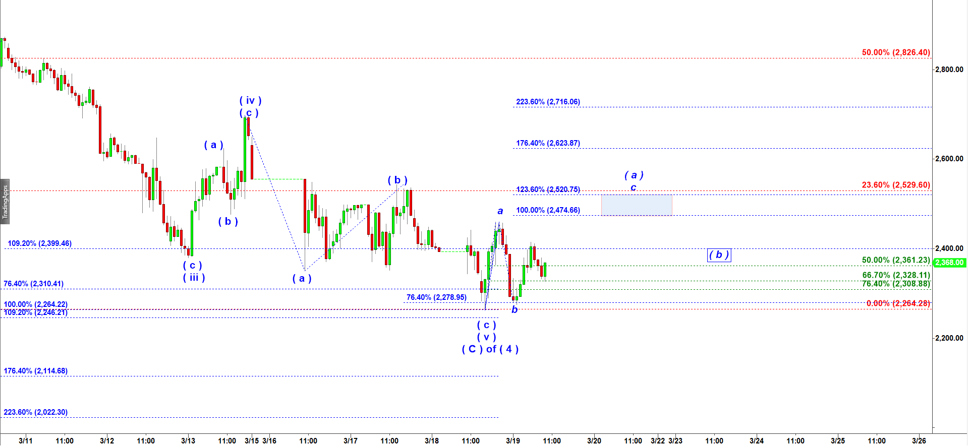 Off the low we should first get choppy a-b-c up followed by a-b-c down. And only then we may expect a stronger rally in wave ( c ) up