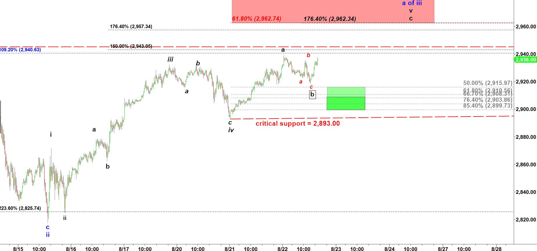 Another micro count suggests that the black wave b down has completed and a new leg up in wave c up has started. Frankly, I favor the first scenario. However, both micro counts expect another rally in wave c up that may go over 2,960.