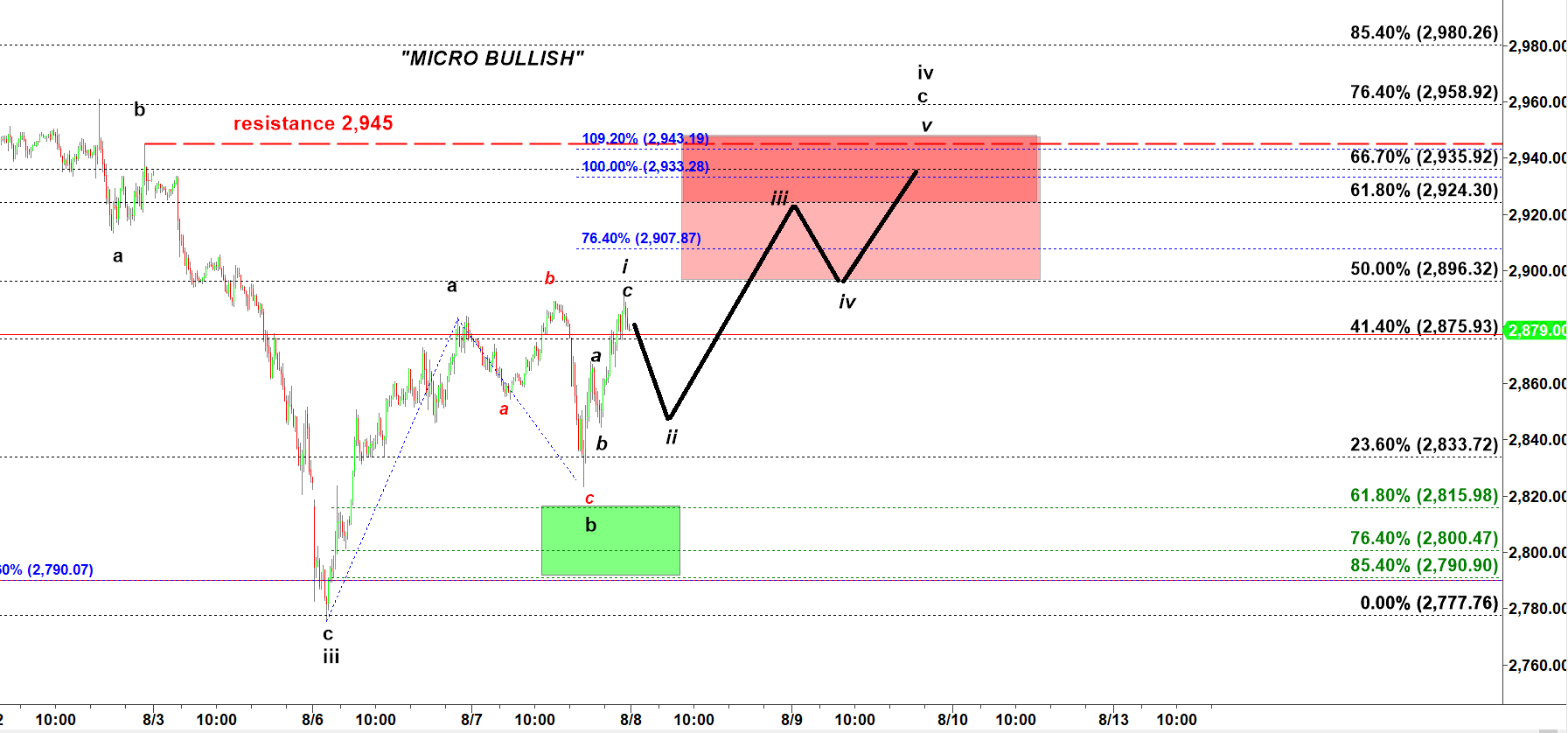The Micro Bullish count also argues for decline but that decline should hold over 2,811. And that would be a micro wave ii down inside wave c of iv up. In conclusion we should see 2,811 as important support level that would define the path for ES.
