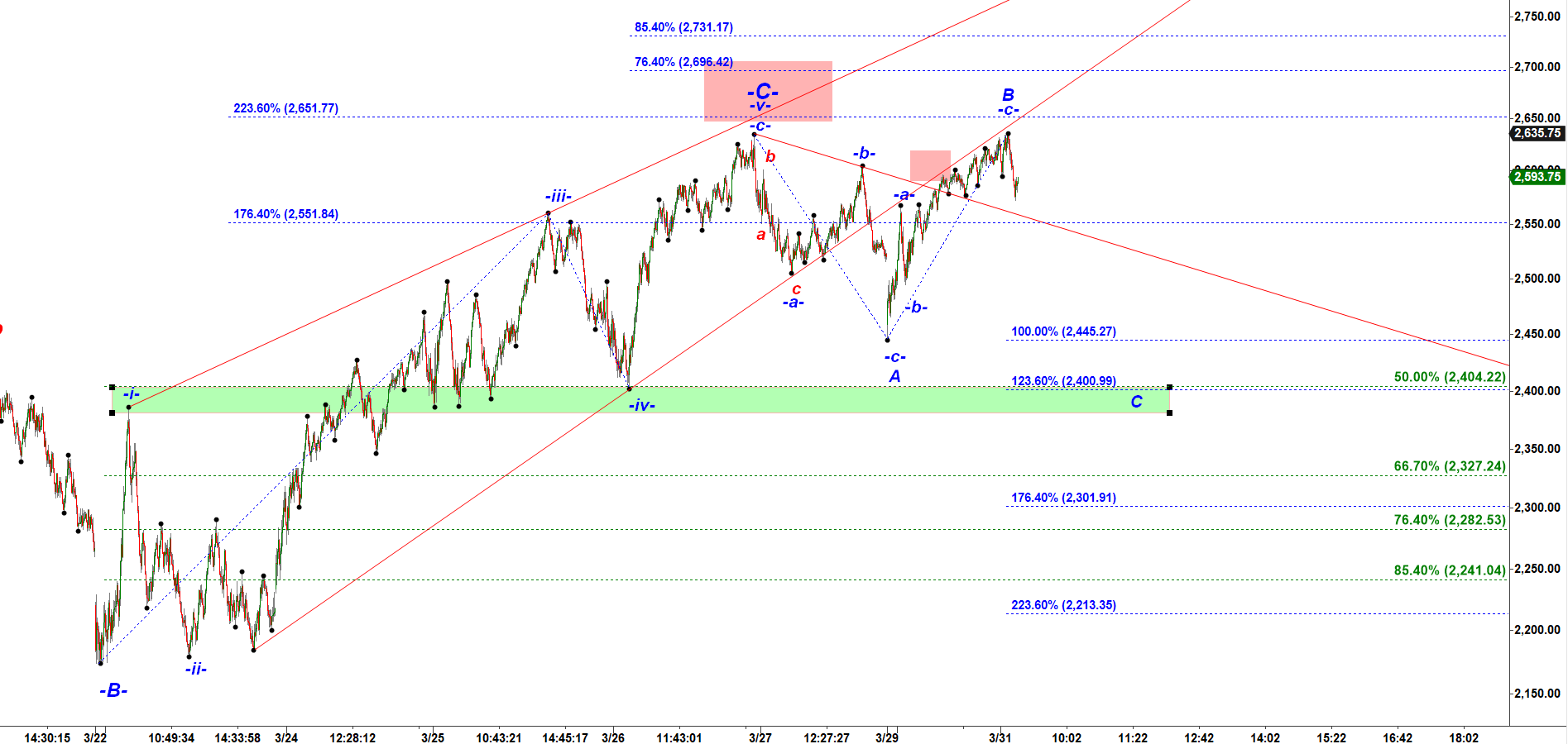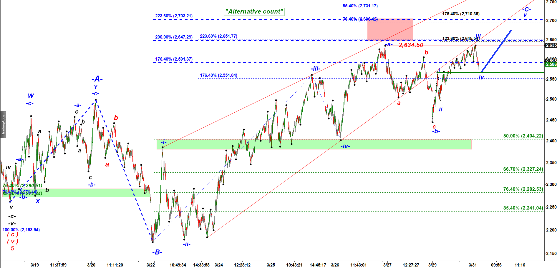 Previously I expected wave v up to stretch to 2,700 but because wave iii failed to tag its target at 2,645 we may not get that high in the final wave v up.