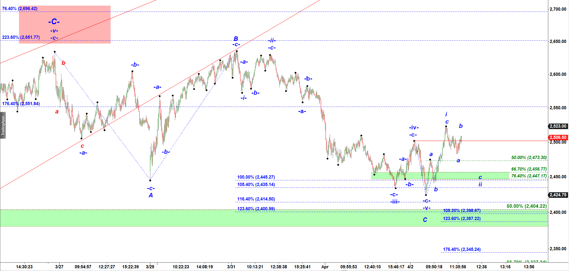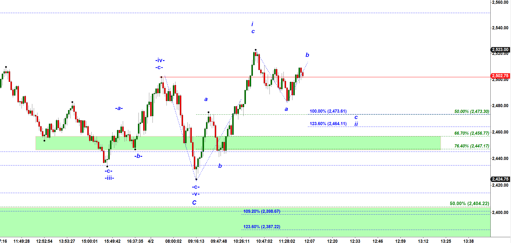 If ES makes another move down in a micro subwave c of wave ii down it may stop at 2,373 – 2, 464.