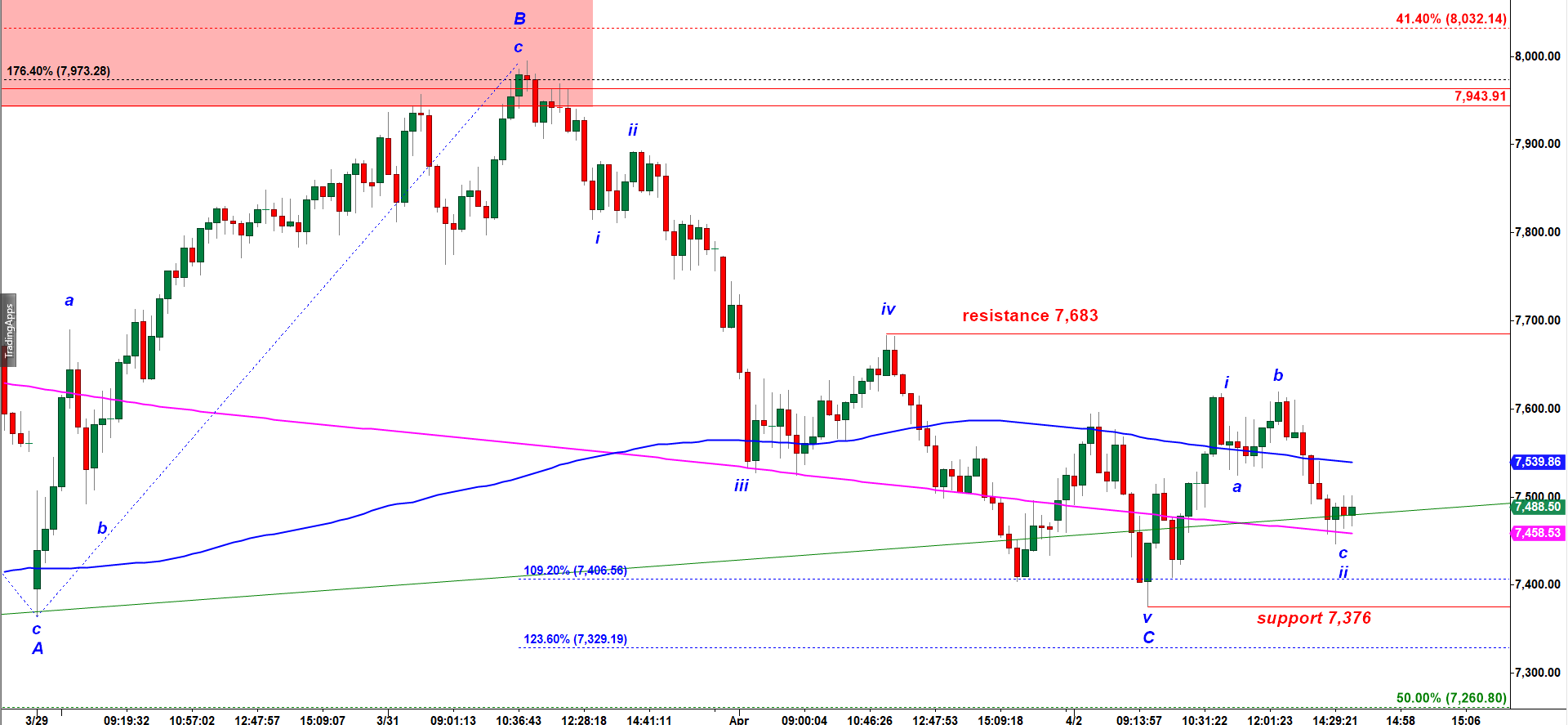 NQ has the very same bullish micro setup. It has to hold over the previous low at 7,376. Breaking that low would invalidate that bullish setup.