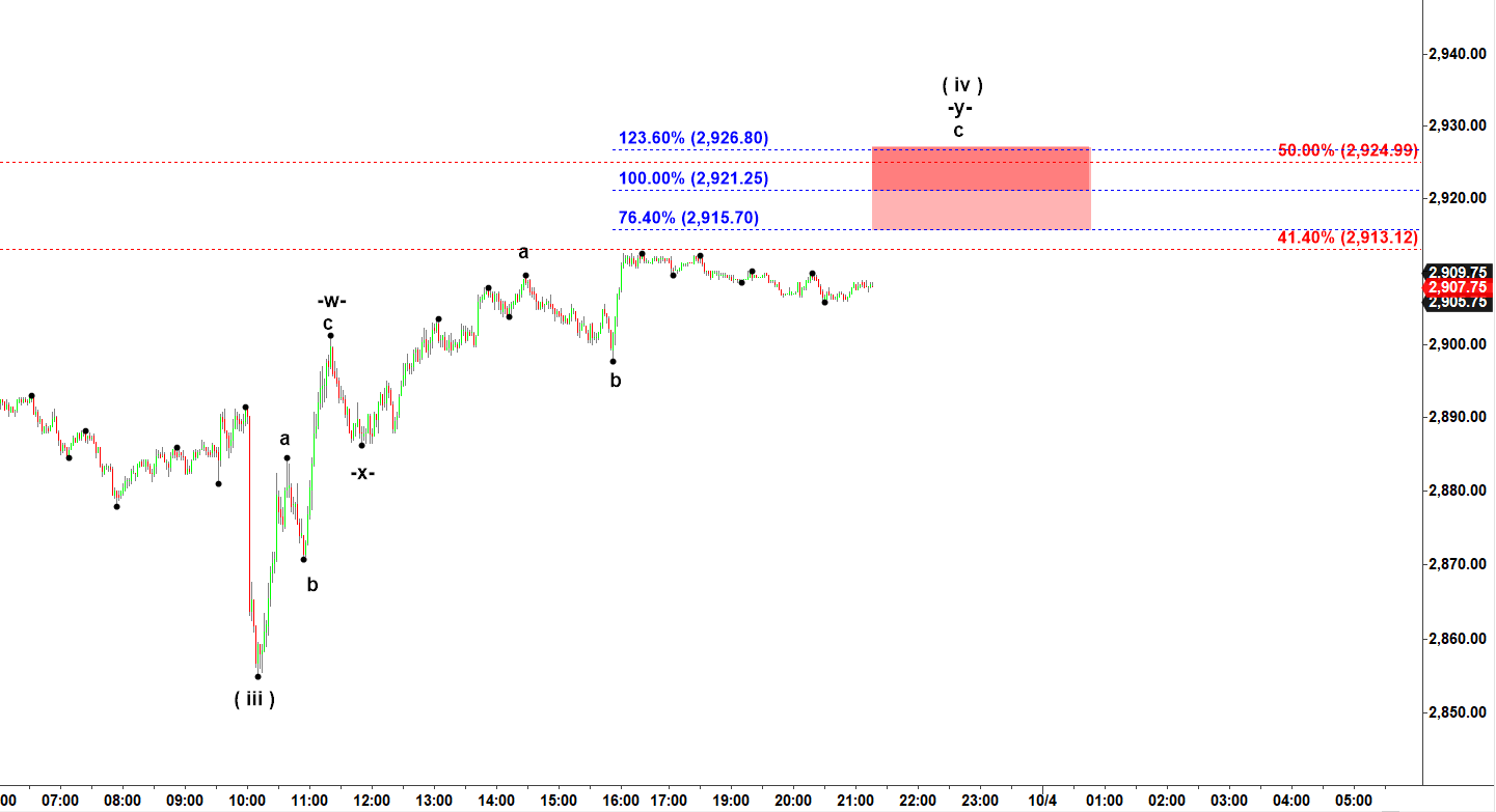 I am switching to 2 min micro chart to check a micro count of the rally that started after exhaustive drop to new lows this morning. On the chart I can see that wave ( iv ) up may top tomorrow morning
